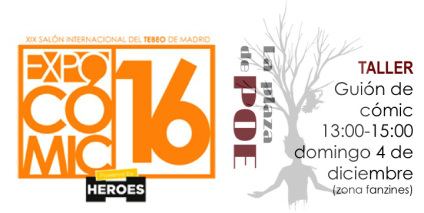 El próximo domingo 4 de diciembre, en la nueva edición del Expocómic, la Feria del Cómic de Madrid, que, este año, se desarrolla en el Pabellón 3 del IFEMA (Feria de Madrid), La Plaza de Poe imparte un Taller de Guión de Cómic de 13 a 15 h. El taller es gratuito (hasta completar aforo), pero hay que apuntarse en contacto@laplazadepoe.com, una vez que se compre la entrada a la feria (15 € entrada individual y 48 € para cada grupo de cuatro personas).
