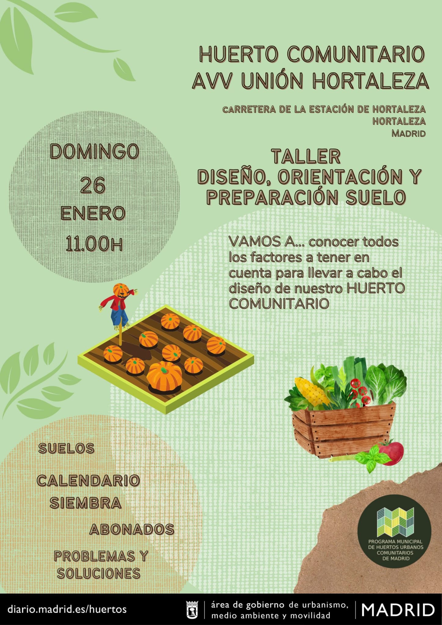 El domingo 26 de enero a las 11.00 horas, se celebra el taller del huerto comunitario AV La Unión de Hortaleza en el parque Doña Guiomar (Carretera de la Estación de Hortaleza), dentro de la Red de Huertos Urbanos de Madrid, impartido desde El Bancal Agroecología (cooperativa medioambiental).