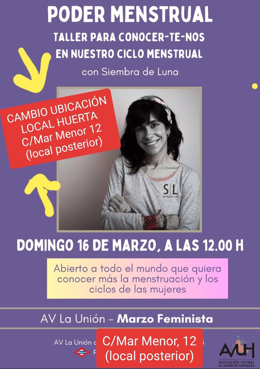 El domingo 16 de marzo a las 12.00 horas, continúa la programación especial por el Día Internacional de la Mujer del mes de marzo de La Unión de Hortaleza con un taller sobre menstruación en el local de la asociación vecinal en la calle Mar Menor, 12 posterior.