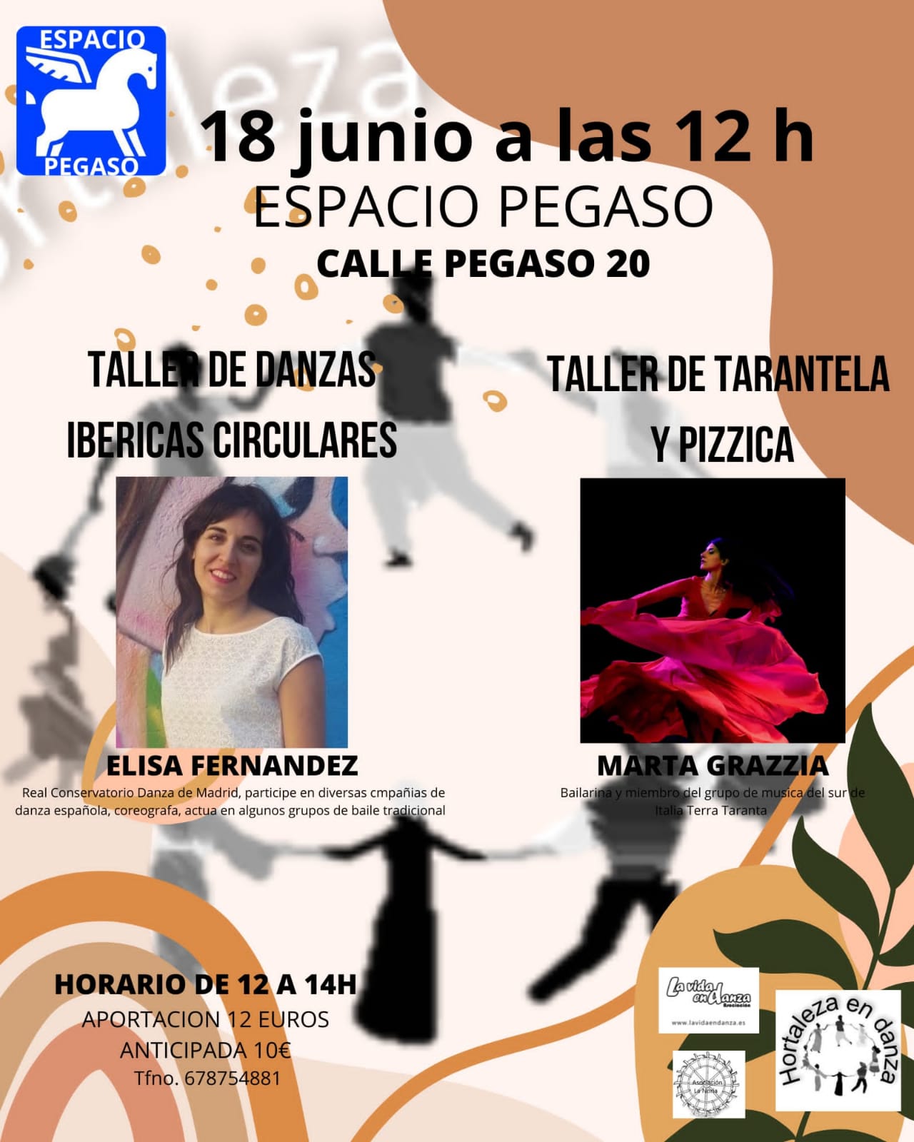 Este domingo 18 de junio a las 12.00 horas, se celebran en el Espacio Pegaso (calle Pegaso, 20) sendos talleres de danzas ibéricas circulares y de tarantela y pizzica, gracias a la colaboración de las asociaciones La Vida en Danza y Hortaleza en Danza.