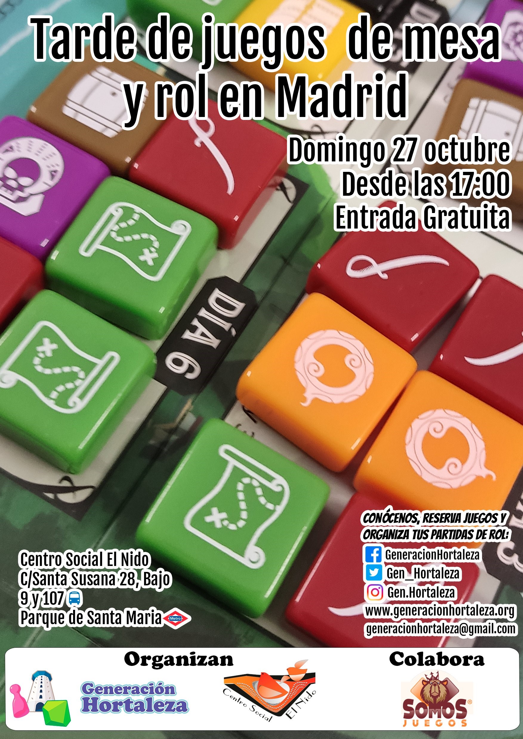 El domingo 27 de octubre a las 17.00 horas, gracias a Generación Hortaleza, en colaboración con Somos Juegos, se organiza una nueva tarde de juegos de mesa y rol en el centro social El Nido (calle Santa Susana, número 28 bajo).
