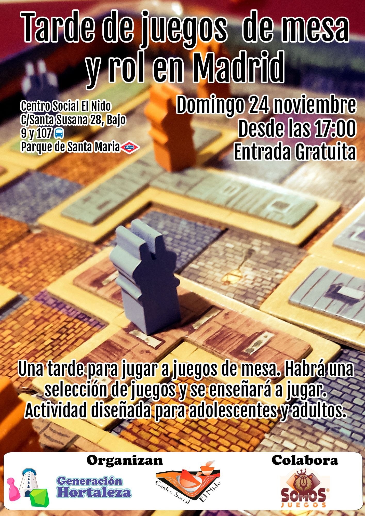 El domingo 24 de noviembre a las 17.00 horas, gracias a Generación Hortaleza, en colaboración con Somos Juegos, se organiza una nueva tarde de juegos de mesa y rol en el centro social El Nido (calle Santa Susana, número 28 bajo).