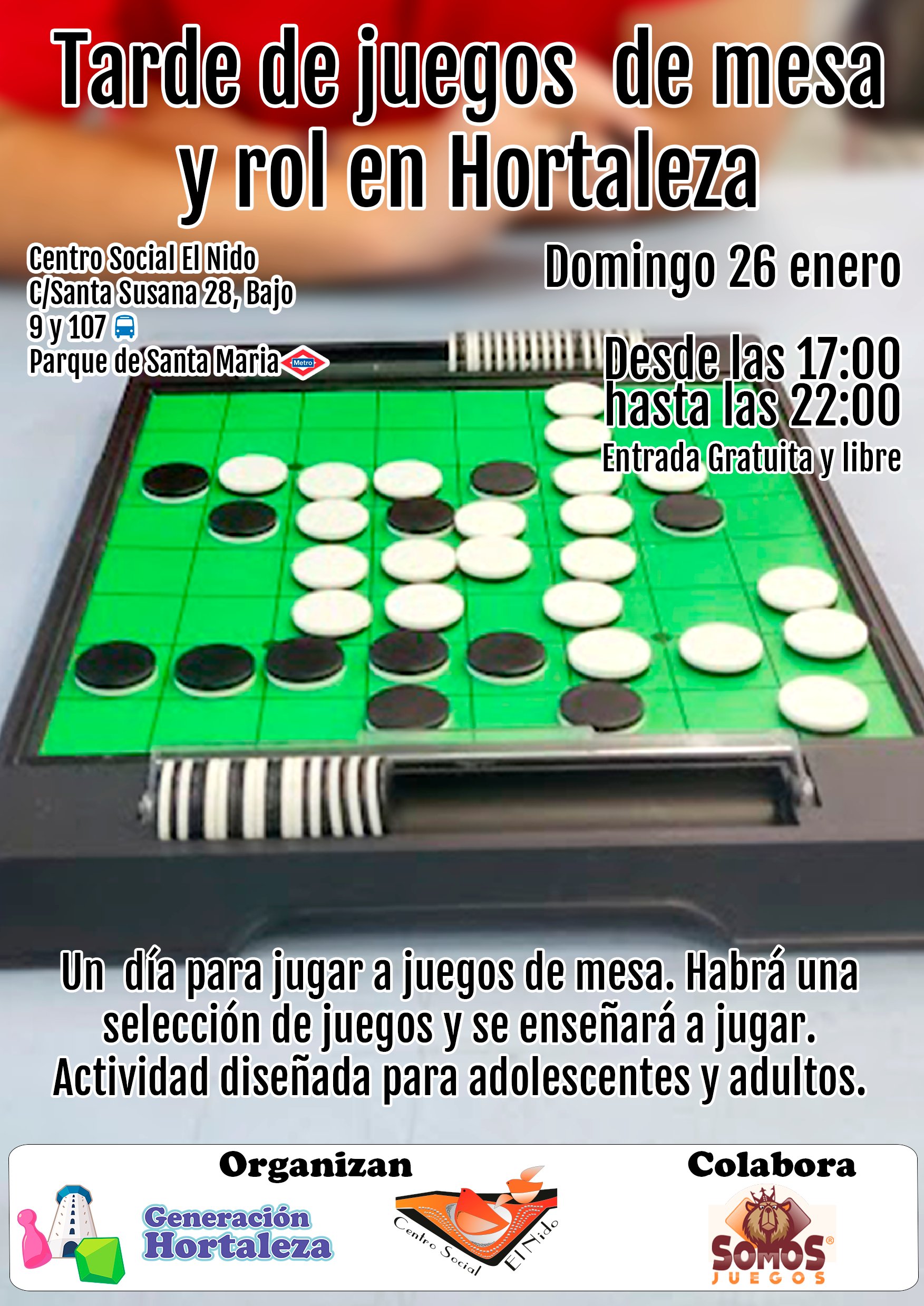 El domingo 26 de enero a las 17.00 horas, gracias a Generación Hortaleza, en colaboración con Somos Juegos, se organiza una nueva tarde de juegos de mesa y rol en el centro social El Nido (calle Santa Susana, número 28 bajo).