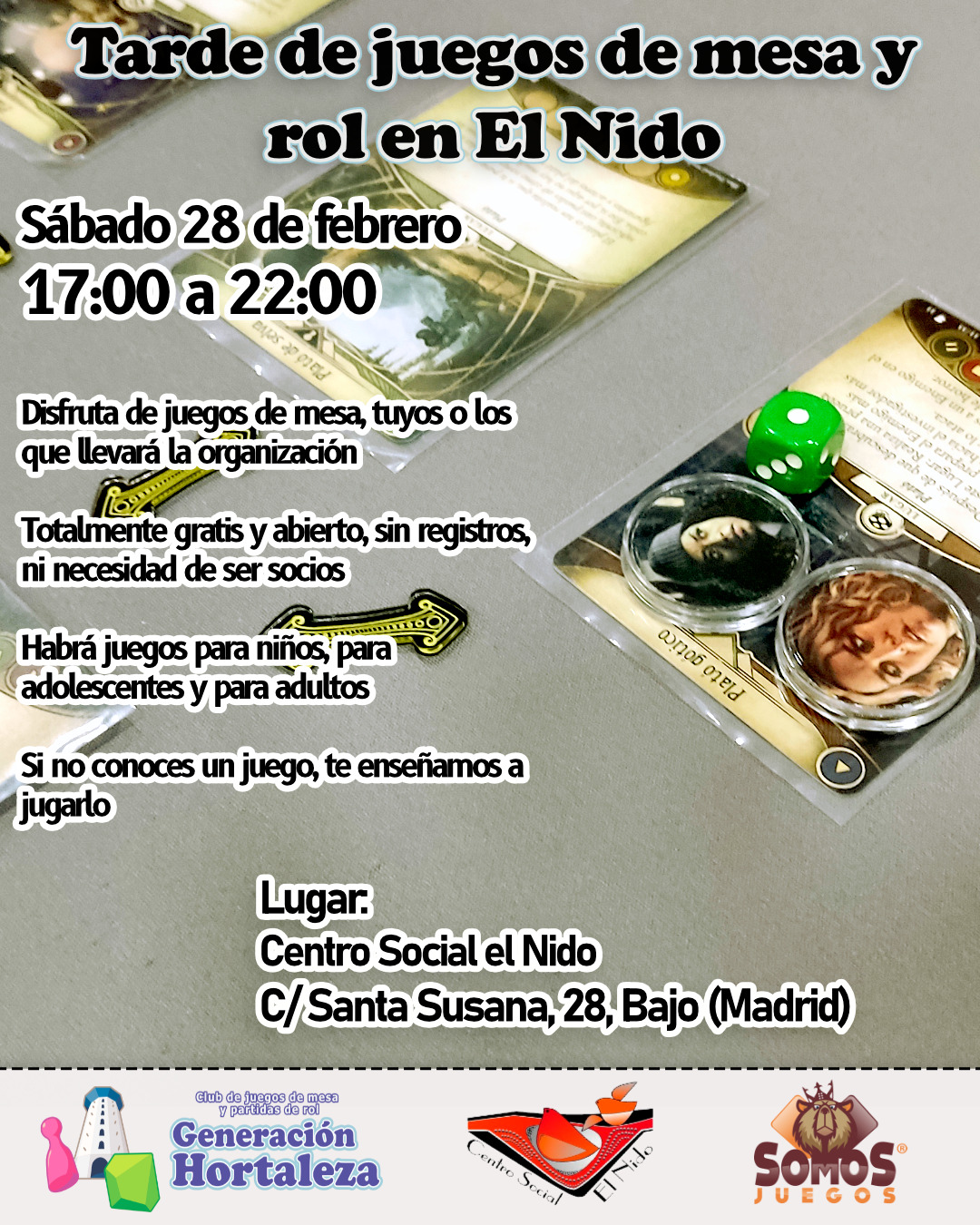 El sábado 28 de febrero desde las 17.00 horas hasta las 22.00 horas, gracias a Generación Hortaleza, en colaboración con Somos Juegos, se organiza una nueva sesión de tarde de juegos de mesa y rol en el centro social El Nido (calle Santa Susana, 28 bajo).