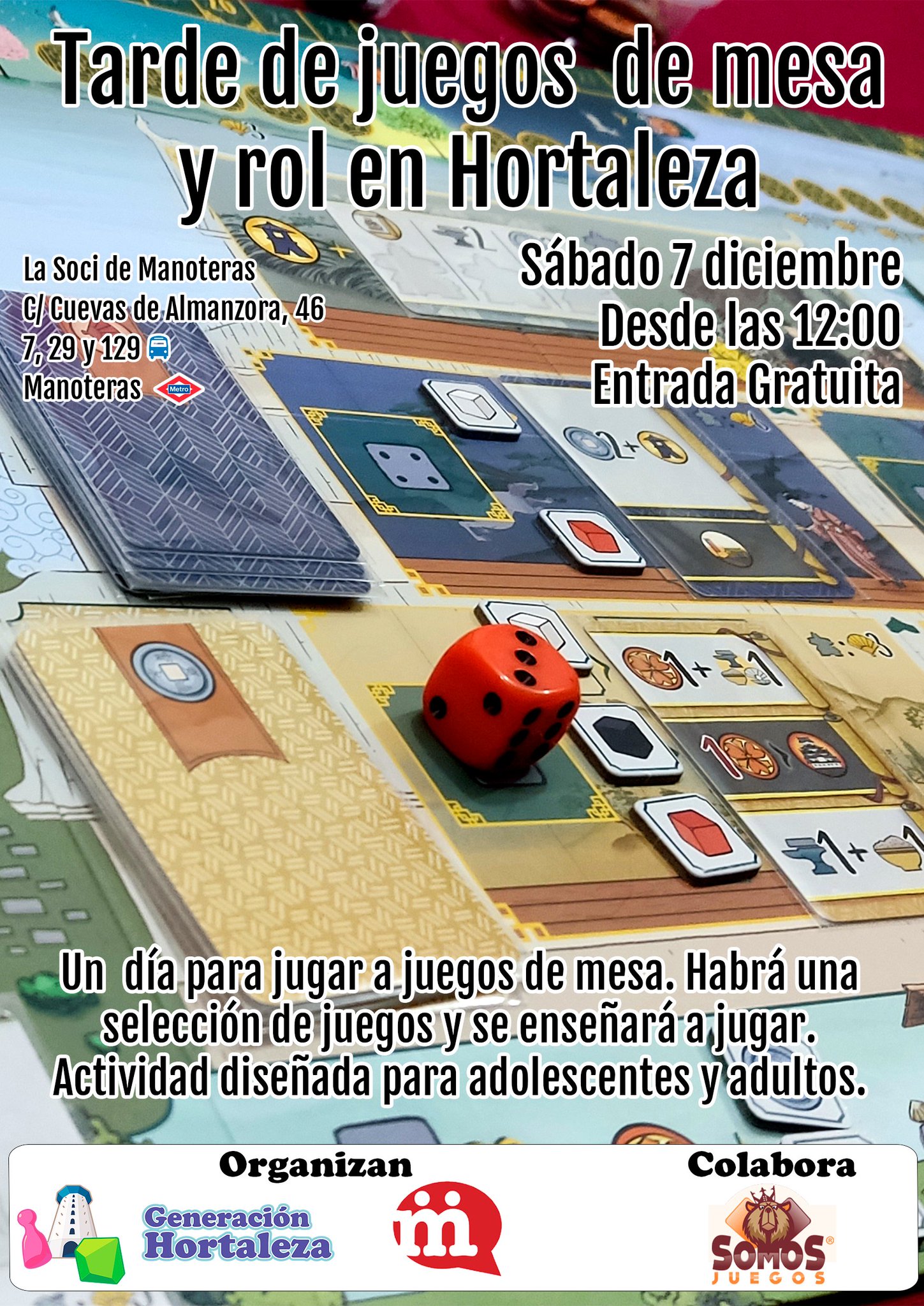 El sábado 7 de diciembre desde las 12.00 horas, se celebra un tarde de juegos de mesa y rol en la Soci de Manoteras en la sede de la asociación vecinal del barrio (Cuevas de Almanzora, 46) organizada por Generación Hortaleza, en colaboración con Somos Juegos.