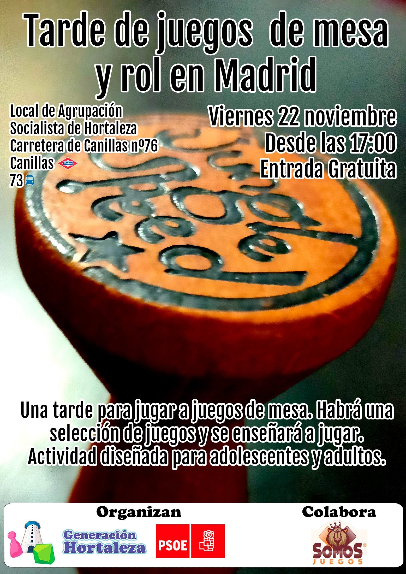 El viernes 22 de noviembre a las 17.00 horas, gracias a Generación Hortaleza, en colaboración con Somos Juegos, se organiza una nueva tarde de juegos de mesa y rol en PSOE Hortaleza, es decir, en el local de la Agrupación Socialista de Hortaleza (Carretera de Canillas, 76).