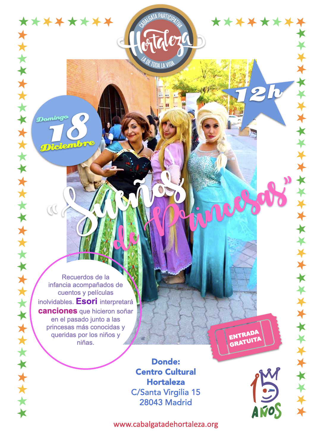 El domingo 18 de diciembre a las 12.00 horas, continúan las actividades que se realizan en apoyo de la Cabalgata Participativa de Hortaleza, con el teatro musical del grupo Esori que ofrecerá el concierto Sueños de princesas en el Centro Cultural Hortaleza (calle Santa Virgilia, 15), donde todas las y los asistentes podrán cantar sus canciones favoritas de la infancia acompañados de cuentos y películas inolvidables.