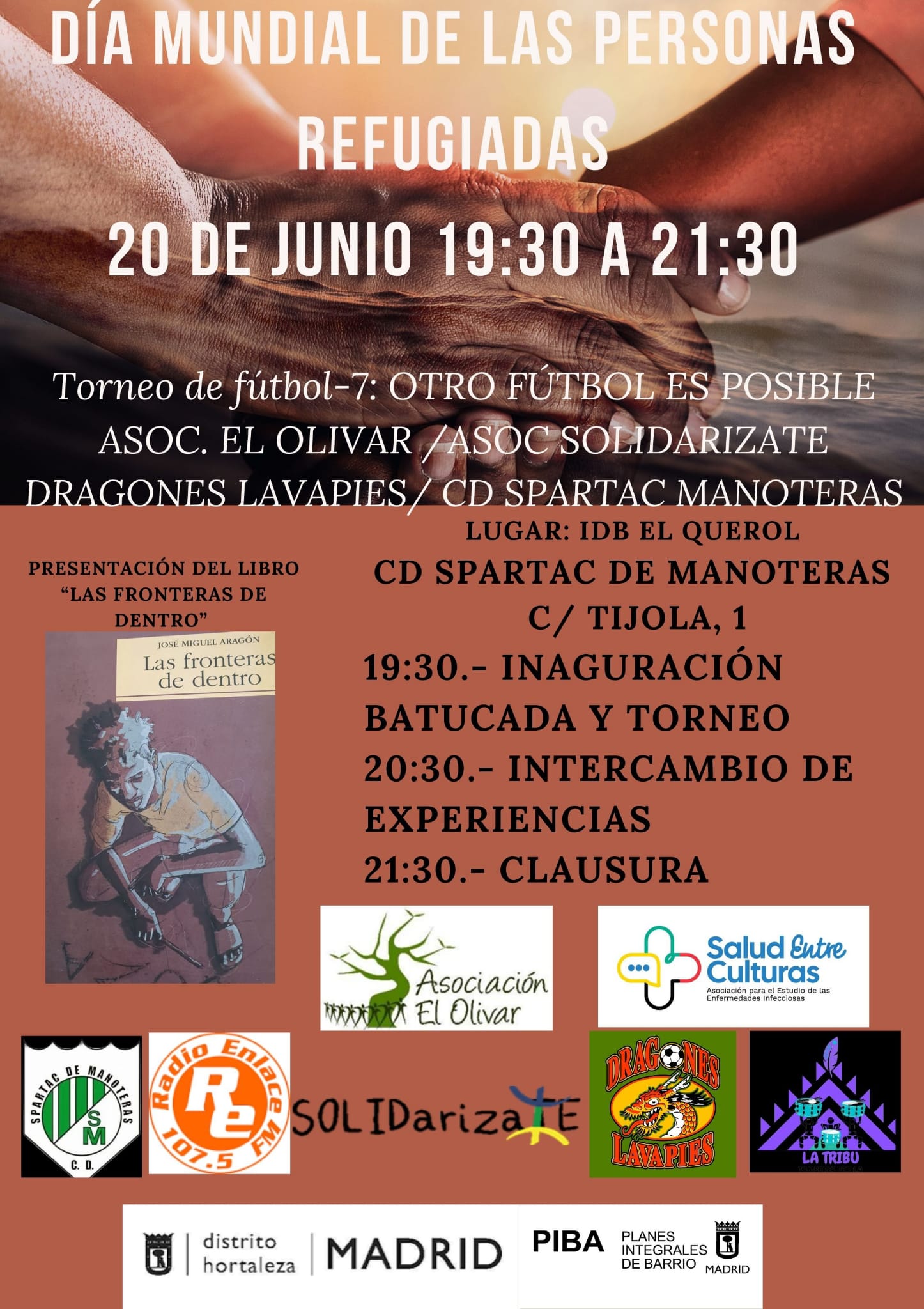 El martes 20 de junio a las 19.30 horas, con motivo del Día Mundial de las Personas Refugiadas, se celebra el Torneo solidario «Otro Fútbol es Posible» en la sede del club deportivo Spartac de Manoteras en la instalación deportiva básica El Querol (calle Tijola, 1), cuyo equipo de fútbol 7 jugará con el club deportivo Dragones de Lavapiés, con la participación de las asociaciones El Olivar y SOLIDarizaTE.
