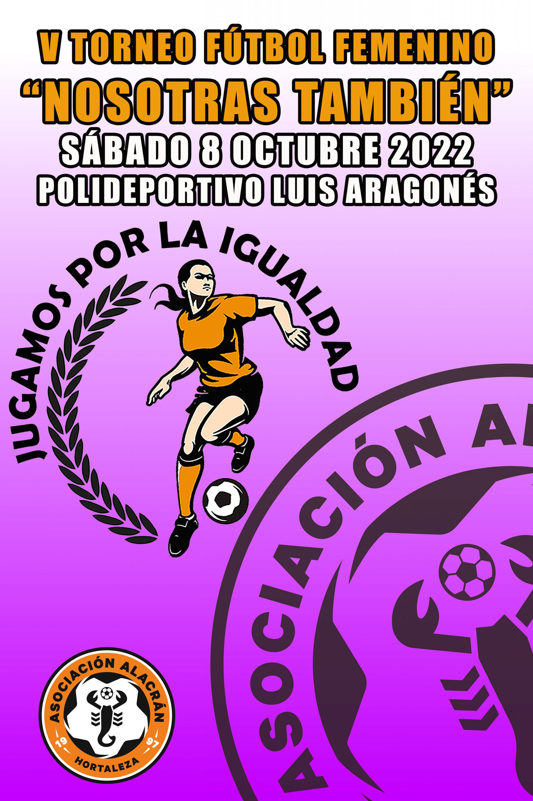 El sábado 8 de octubre, desde las 10.00 hasta las 15.00 horas, la asociación Alacrán 1997 celebra la quinta edición del torneo de fútbol sala femenino Nosotras También en las instalaciones del centro deportivo municipal Luis Aragonés (calle El Provencio, 20).