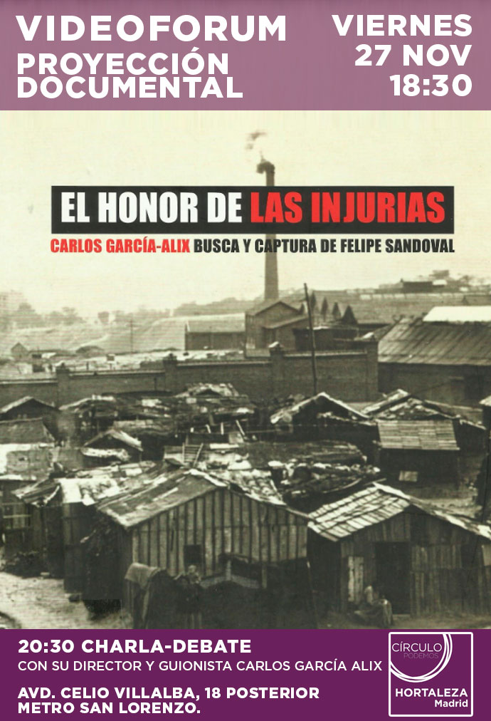 El Círculo de Podemos Hortaleza proyecta el próximo viernes 27 de noviembre a las 18:30 horas la película documental que narra la vida de Sandoval, también conocido por el alias Doctor Muñiz, albañil, ayuda de cámara de una noble familia de París, atracador, anarquista y espía, pero conocido especialmente por ser un activo verdugo revolucionario en el Madrid de los primeros meses de la Guerra Civil Española.