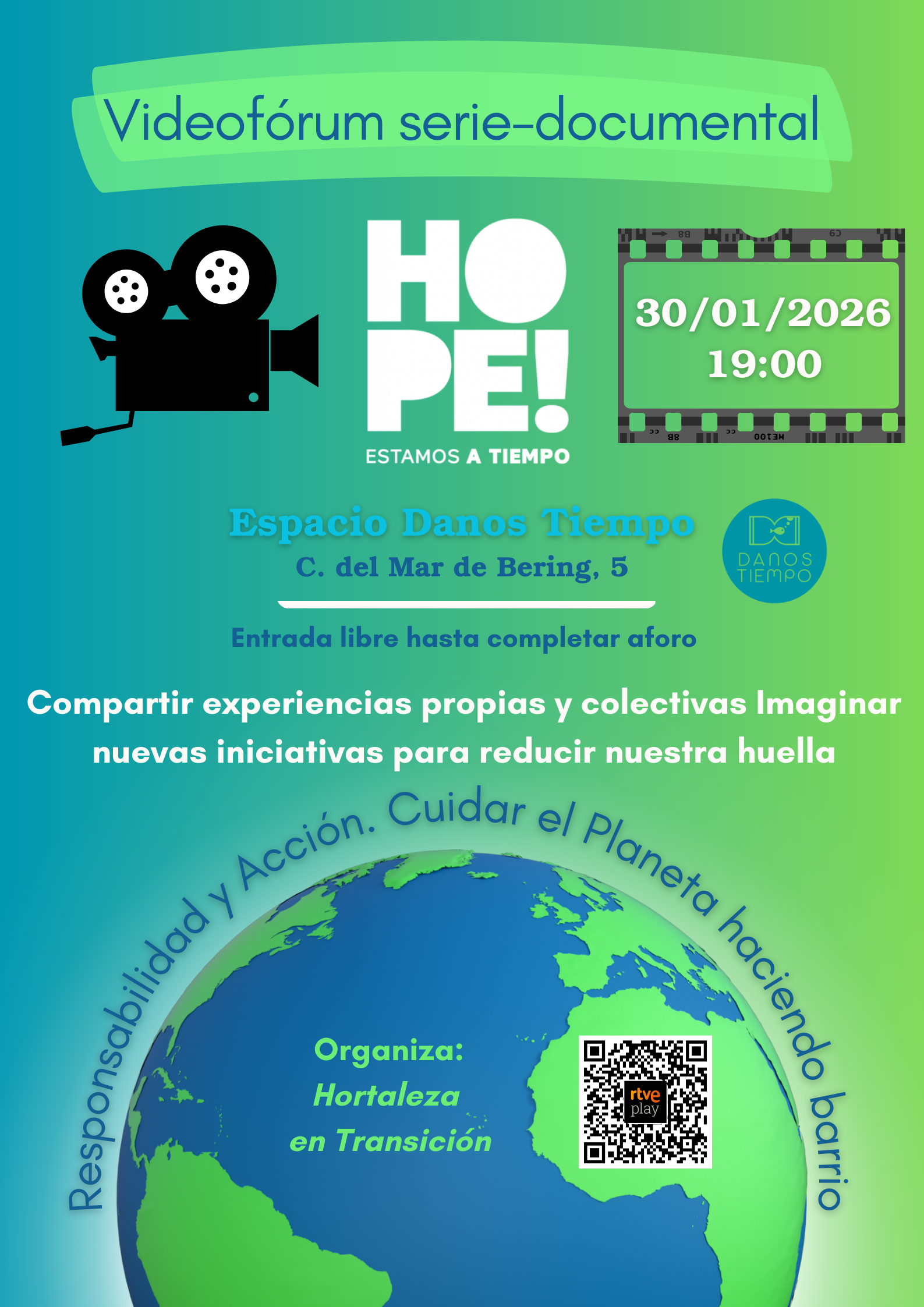 El viernes 30 de enero a las 19.00 horas, se invita al vecindario a participar en un videofórum sobre la serie documental Hope! Estamos a tiempo en el Espacio Danos Tiempo (calle Mar de Bering, 5) organizado por Hortaleza en Transición.