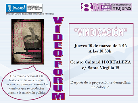 El próximo 10 de marzo a las 18.30 h, se celebra un videofórum por el Día de la Mujer en el centro cultural de Hortaleza (Santa Virgilia, 15), con la proyección del documental Vindicación de Susana Koska: una mirada personal a la historia de las mujeres que vivieron en primera persona los cambios que se producían durante la transición política. Después de su visionado, se realizará un coloquio.