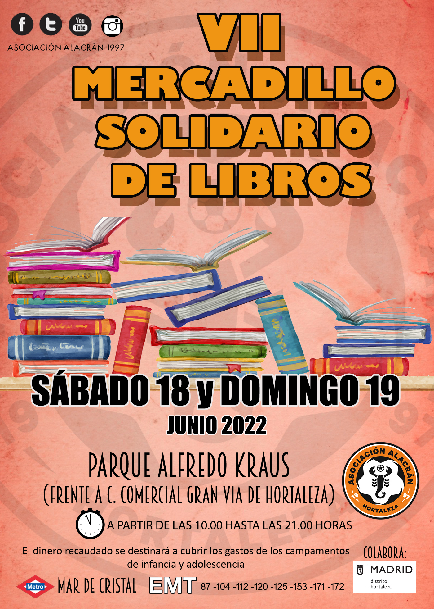 El sábado 18 y el domingo 19 de junio, la asociación Alacrán 1997 celebra la séptima edición de su Mercadillo Solidario de Libros con el objetivo de obtener beneficios para poder financiar los campamentos urbanos de infancia y adolescencia de fin de curso.