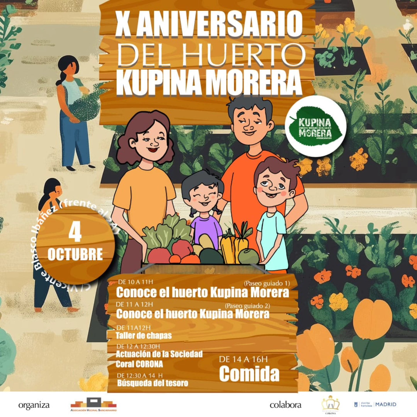 El sábado 4 de octubre a partir de las 10.00 horas, se celebra el X aniversario del huerto comunitario Kupina Morera, gestionado por la asociación vecinal de Sanchinarro y situado en la confluencia de la calle Vicente Blasco Ibáñez y la avenida Ingeniero Emilio Herrera, dentro de la Red de Huertos Urbanos de Madrid.