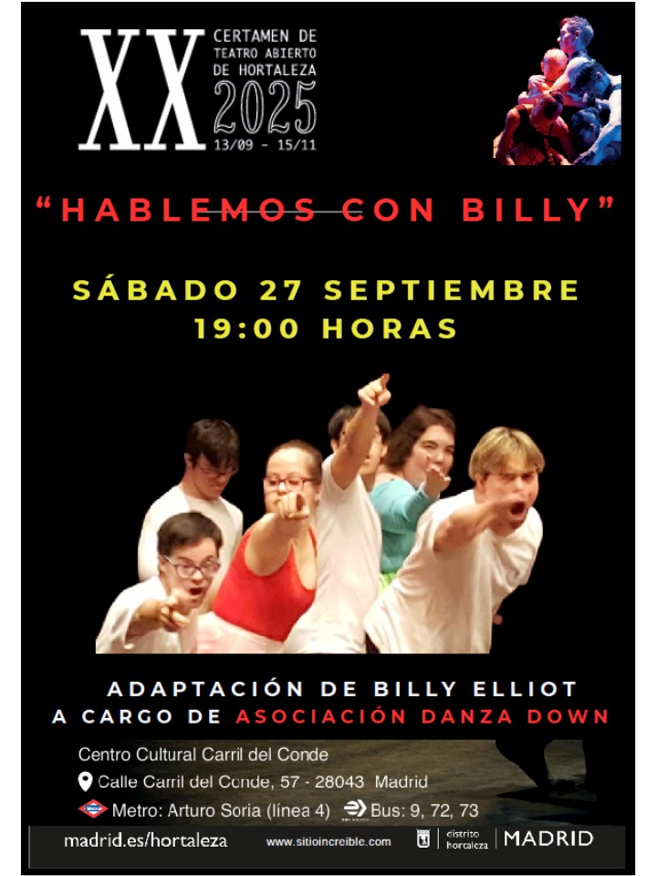 El sábado 27 de septiembre a las 19.00 horas, dentro del XX Certamen de Teatro Abierto de Hortaleza, podrá disfrutarse de la representación de la obra Hablemos con Billy de la asociación Danza Down en el auditorio del centro cultural Carril del Conde (calle Carril del Conde, 57).