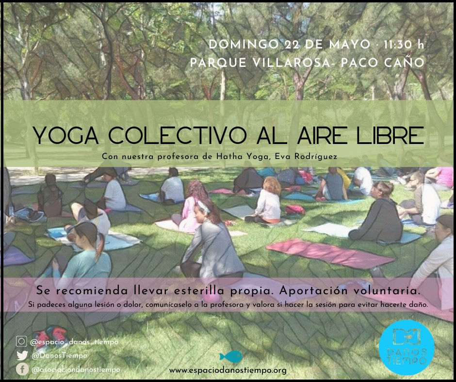 El domingo 22 de mayo a las 11.30 horas en el parque Villa Rosa-Paco Caño (calle de las Predoñeras), la profesora de hatha yoga Eva Rodríguez, que imparte normalmente sus clases en el Espacio Danos Tiempo, hará una sesión de yoga colectivo al aire libre.