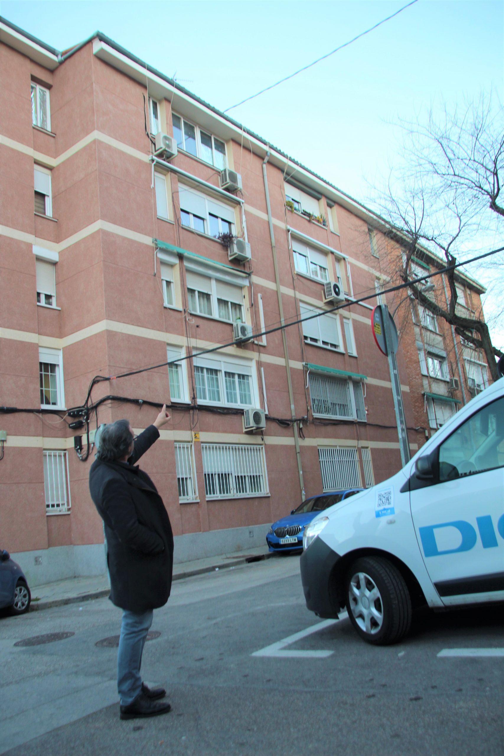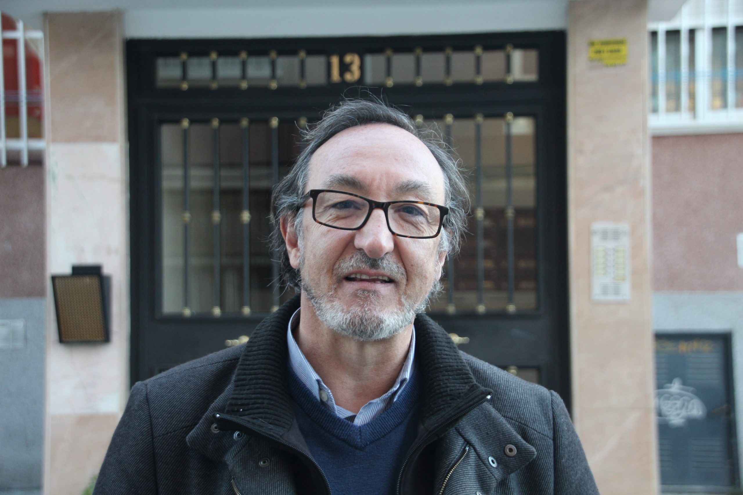 Fernando Olmeda frente al portal en el que vivía en Manoteras. ANA NAFSI