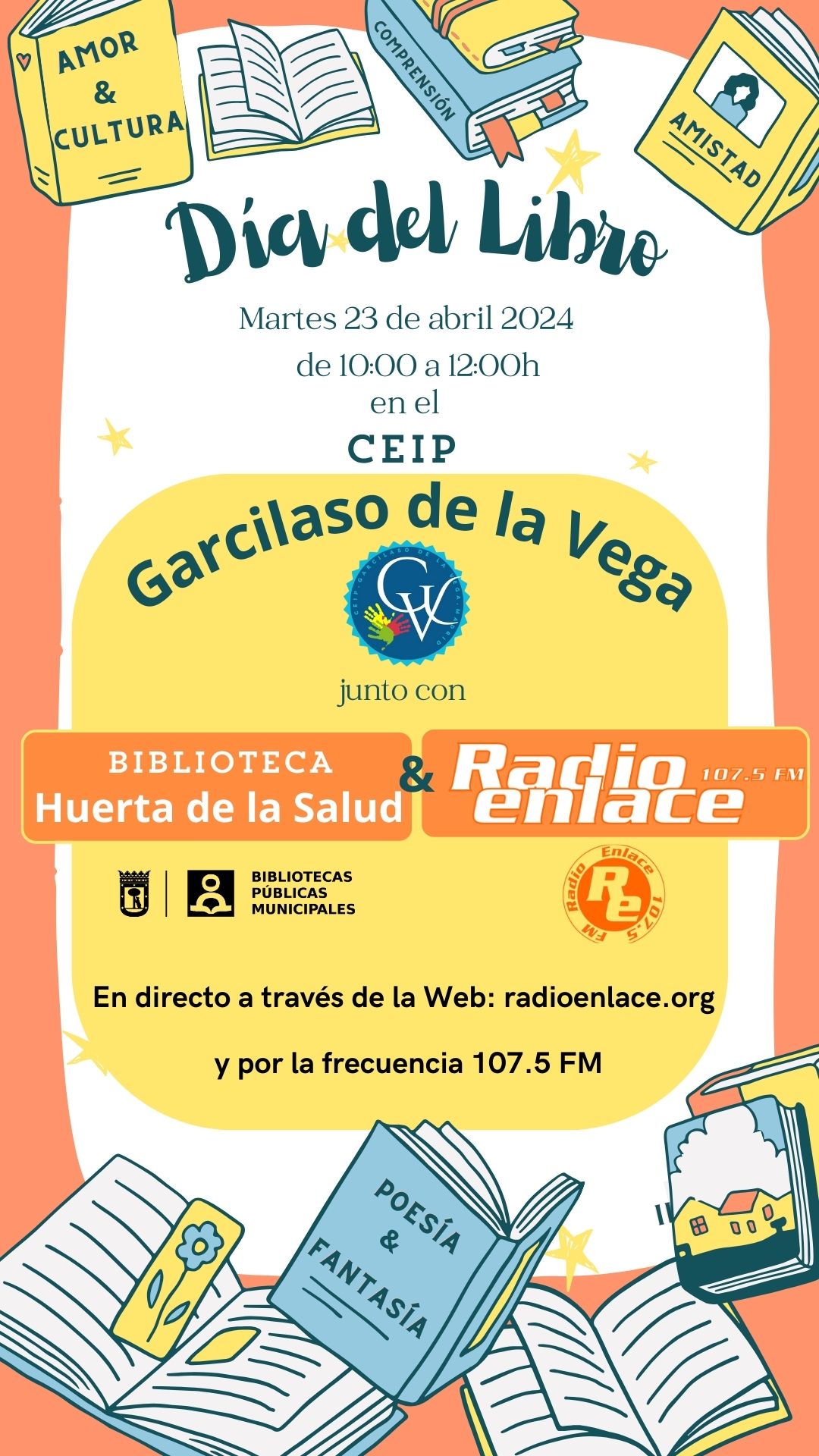 Como viene siendo habitual, la biblioteca Huerta de la Salud y Radio Enlace se unen para celebrar el Día Internacional del Libro, este martes 23 de abril, con un programa de radio especial. Este año se llevarán micrófonos y libros al colegio público Garcilaso de la Vega, en Canillas, desde donde harán llegar en directo al distrito, de 10.00 a 12.00 horas, las lecturas que el alumnado y otras personas ligadas a este centro realizarán para homenajear al que sigue siendo el soporte por excelencia del aprendizaje y la cultura.
