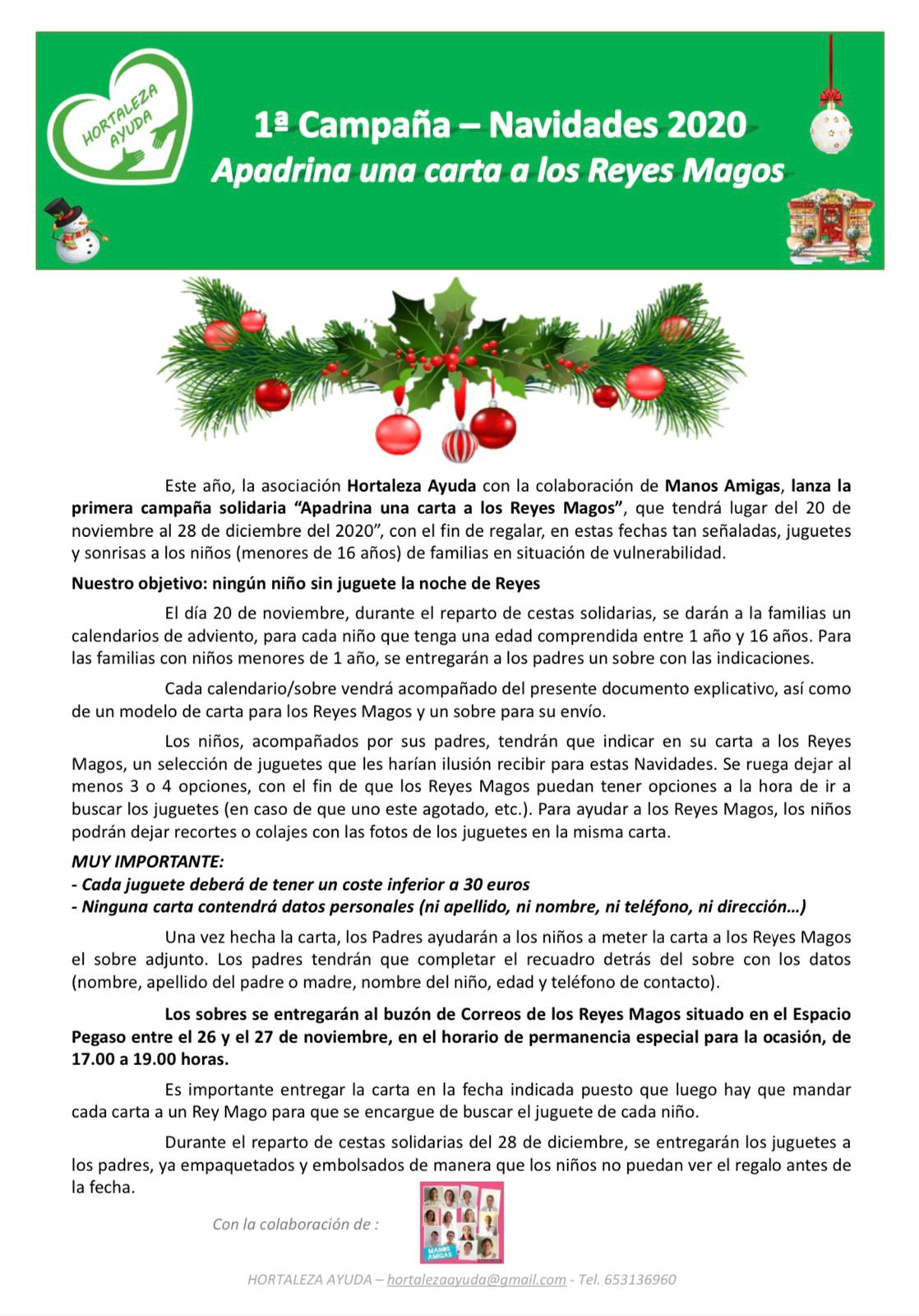 Falta poco para las fiestas de Navidad y en Hortaleza Ayuda no quieren que ningún niño o niña se quede sin un juguete la noche de los Reyes Magos. Por eso, han lanzado la campaña «Apadrina una carta a los Reyes Magos» del 20 de noviembre al 28 de diciembre. En la que los niños de 1 a 16 años pueden escribir a sus Majestades los juguetes que les gustaría recibir con la condición de que su coste sea inferior a 30 euros.