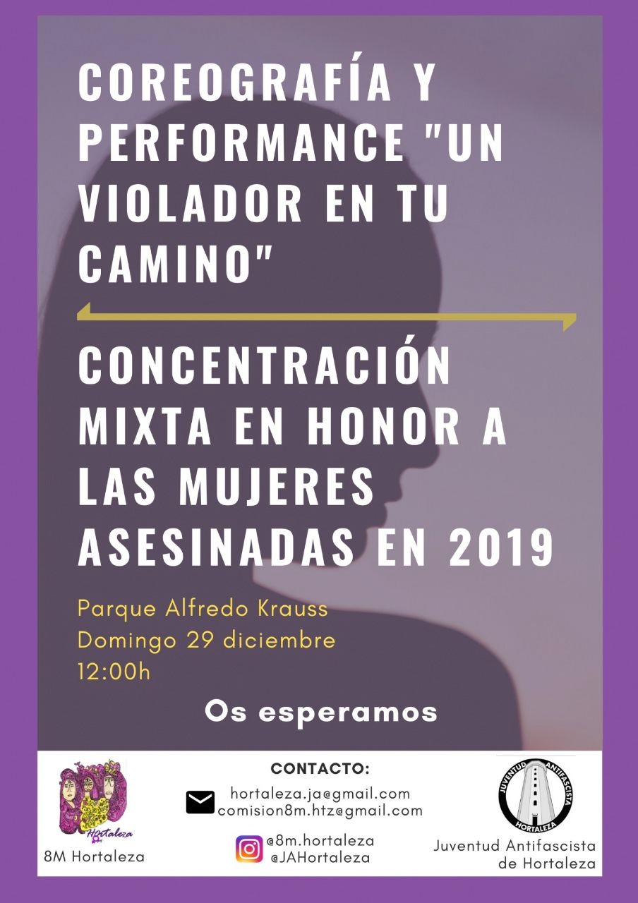La Comisión 8M Hortaleza, junto al colectivo juvenil Juventud Antifascista de Hortaleza, convocan el próximo domingo 29 de diciembre a las 12.00 horas en el parque Alfredo Kraus una concentración en recuerdo de todas las mujeres asesinadas por violencia machista en el 2019.