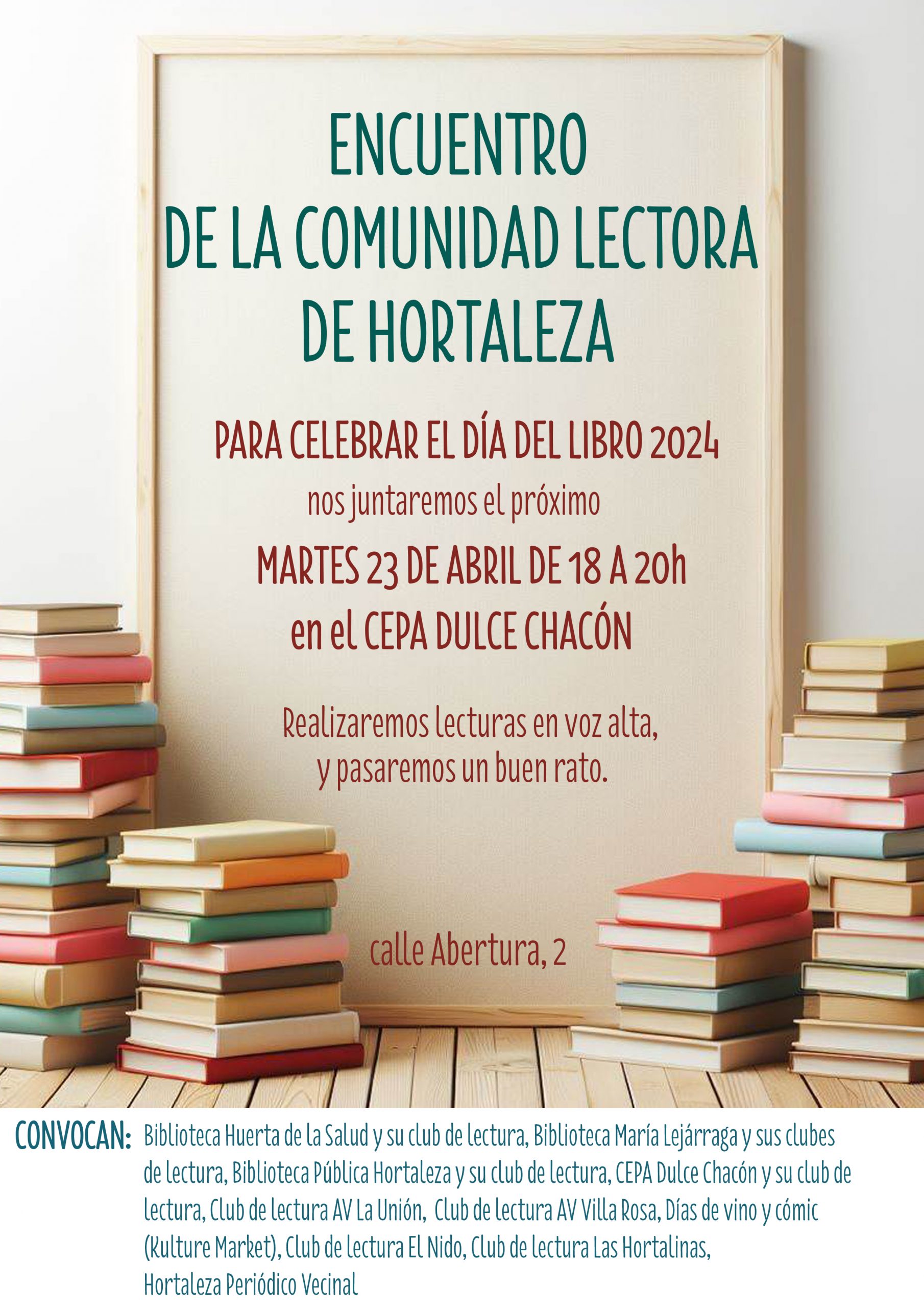 Convocan colectivos tanto vecinales como institucionales, unidos más allá de fronteras. Son, por orden alfabético: la biblioteca Huerta de la Salud y su club de lectura, la biblioteca María Lejárraga y sus clubes de lectura, la Biblioteca Pública Hortaleza y su club de lectura, el CEPA Dulce Chacón y su club de lectura, el club de lectura de la asociación vecinal La Unión de Hortaleza, el club de lectura de la asociación vecinal Villa Rosa, Días de Vino y Cómics (Kulture Market), el club de lectura Las Hortalinas y Hortaleza Periódico Vecinal. Los convocantes esperan que se sumen más grupos al llamamiento.