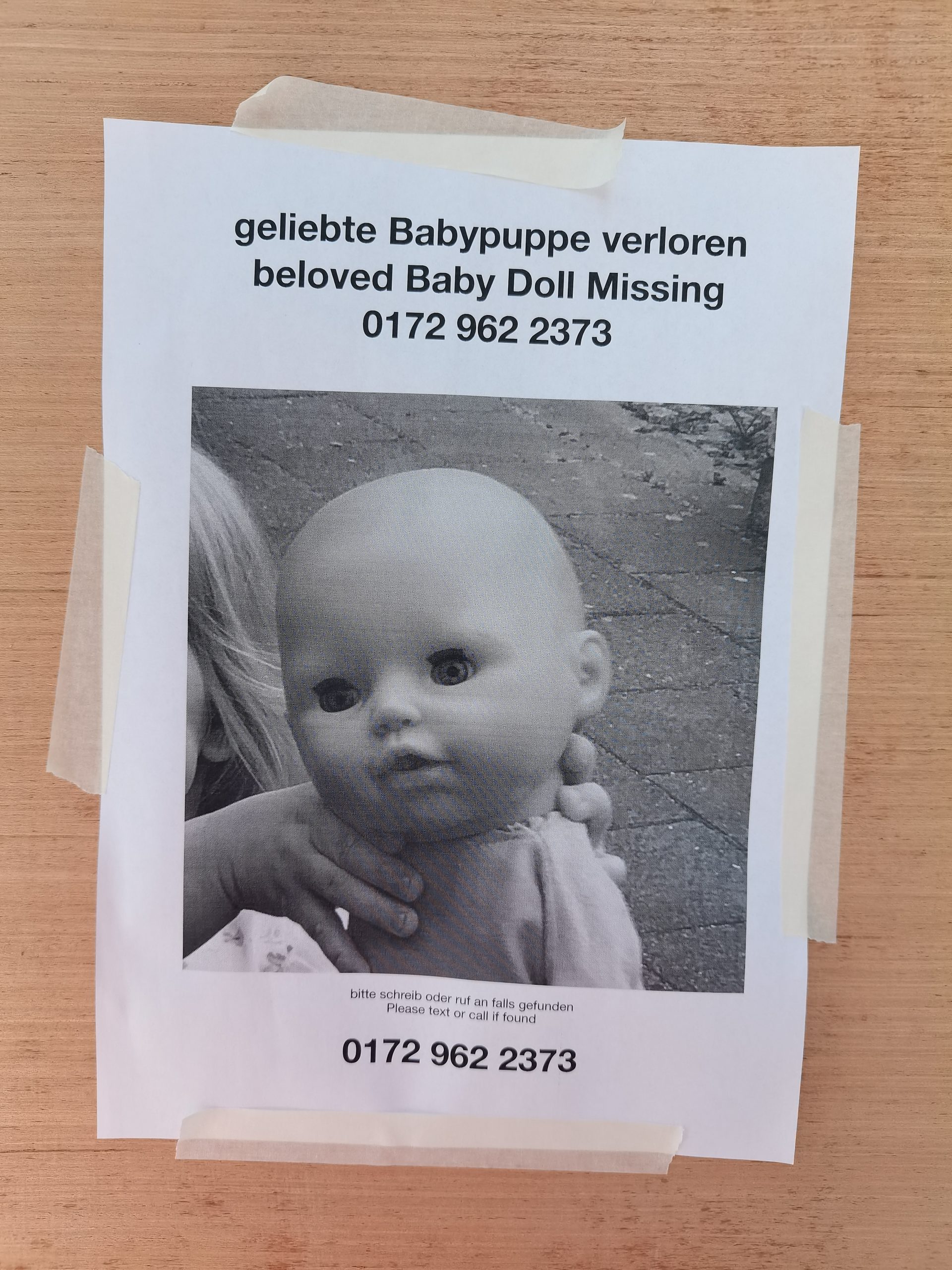 En una fría mañana de otoño, una niña alemana busca su muñeco por las calles de Zehlendorf igual que hiciera Jimena cuando buscaba el suyo en las de Hortaleza hace unos meses. Ambas apelan a la comunidad para encontrarlo y pegan carteles en postes y muros en un último intento por recuperar a sus amados compañeros de juego.