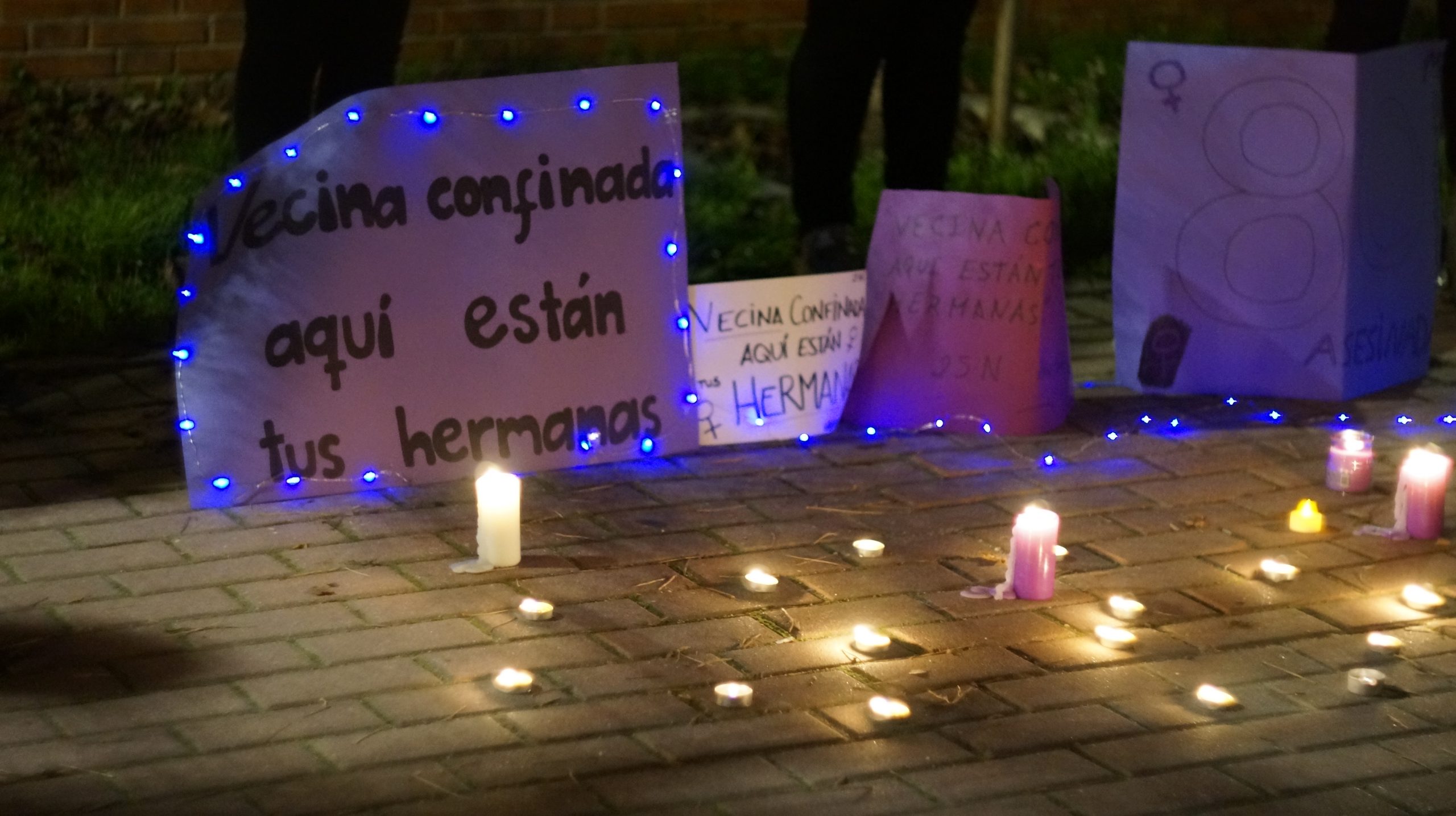 Pancartas colocadas junto a las velas y luces moradas que iluminaban el acto. ÁNGEL SÁNCHEZ