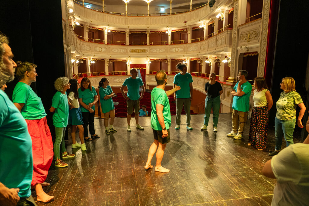 Artistas internacionales de ImproLANDS junto con participantes en el Teatro Municipal de Caldarola durante la residencia italiana.