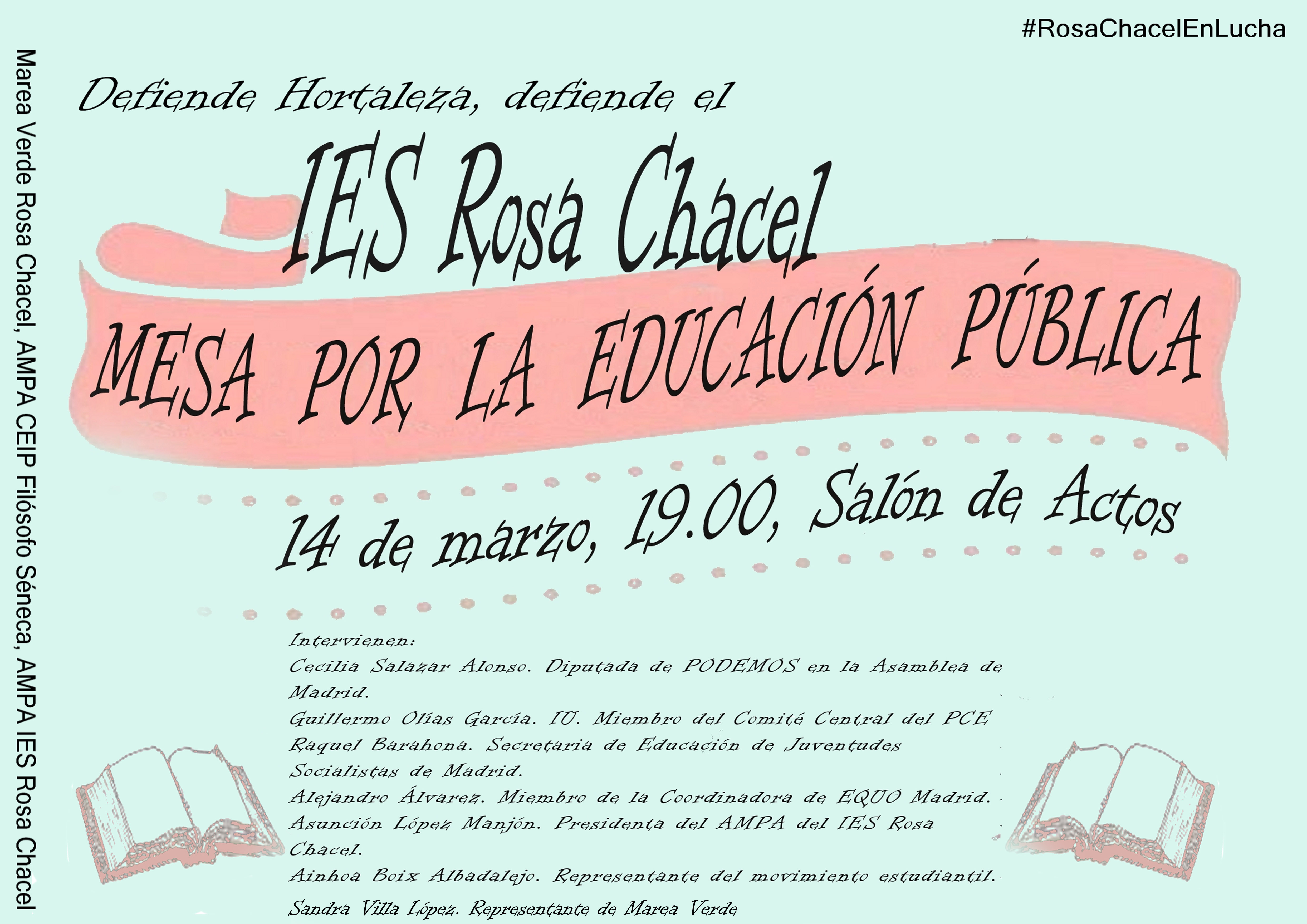 Sin duda, este anuncio de cierre caldeará mañana la Jornada en Defensa de la Educación Publica, que se celebra en el mismo instituto, en la que está anunciada una mesa redonda que comenzará a las 19.00 horas en el salón de actos del centro con la intervención de Cecilia Salazar Alonso (diputada de Podemos en la Asamblea de Madrid), Guillermo Olías García (miembro del Comité Central del PCE), Raquel Barahona (secretaria de Educación de Juventudes Socialistas de Madrid), Alejandro Álvarez (miembro de la Coordinadora Equo de Madrid), Asunción López Manjón (presidenta del AMPA), Ainhoa Boix Albadalejo (representante del movimiento estudiantil) y Sandra Villa López (representante de la Marea Verde).