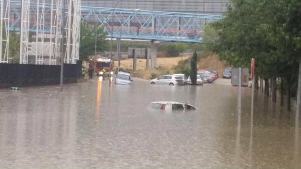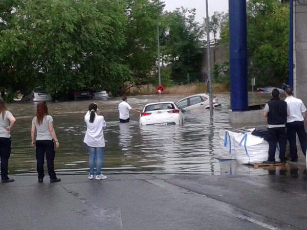 Vehículos arrastrados por el agua en el exterior del centro comercial Campo de las Naciones / Foto enviada por Inma Amores