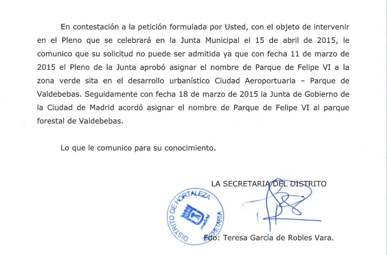 Según el escrito remitido a la asociación, que pretendía preguntar al concejal por el cambio de nombre del parque forestal de Valdebebas, no podrán intervenir al haberse aprobado ya en el Pleno de marzo que la zona verde pase a llamarse ‘Parque Felipe VI‘, una decisión que provocó la protesta silenciosa de los vecinos de Las Cárcavas durante aquella sesión.