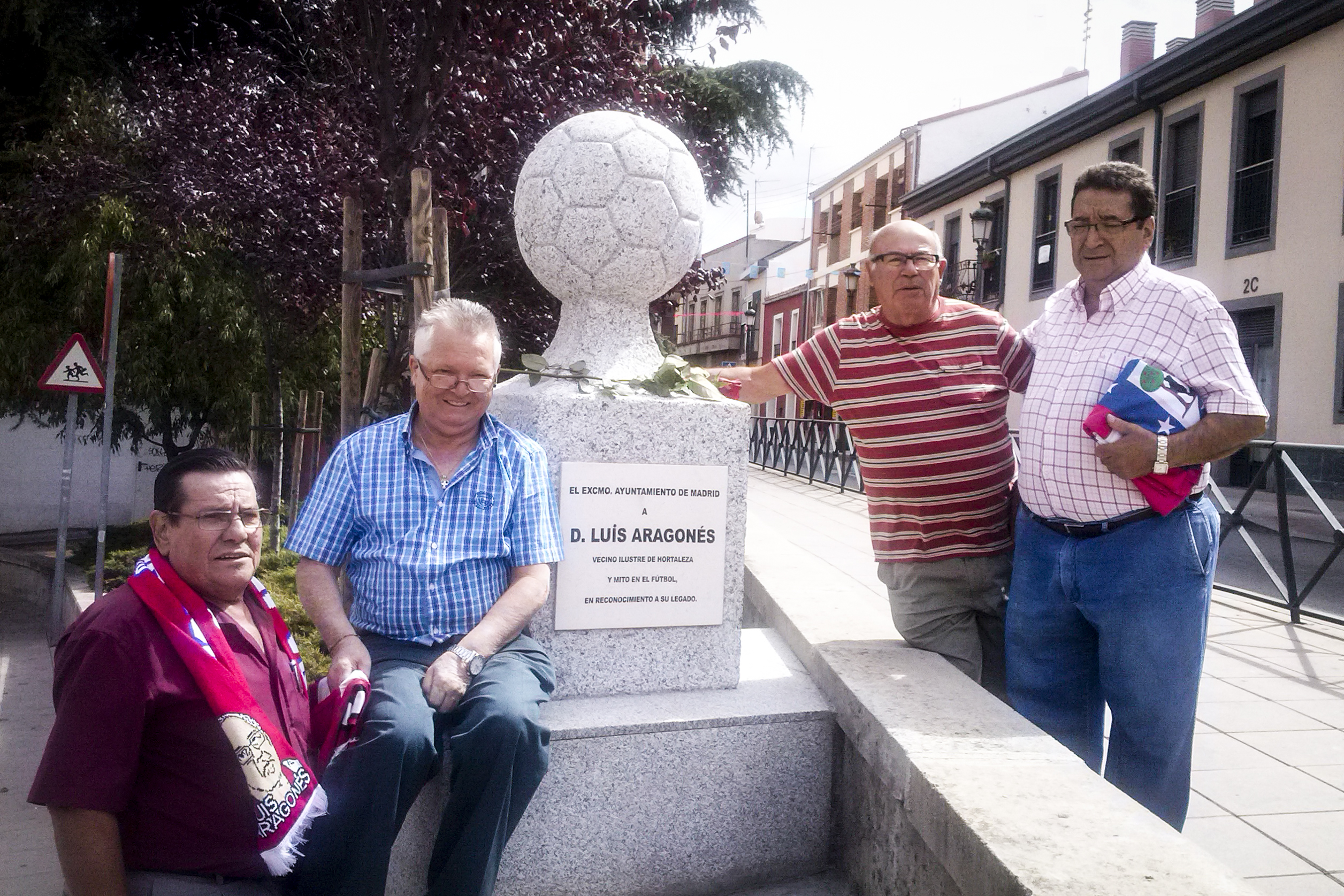 Varios socios de la peña, entre ellos el tesorero Rubén Sánchez, junto al monumento levantado a Luis Aragonés en Hortaleza. PEÑA ATLÉTICA LUIS