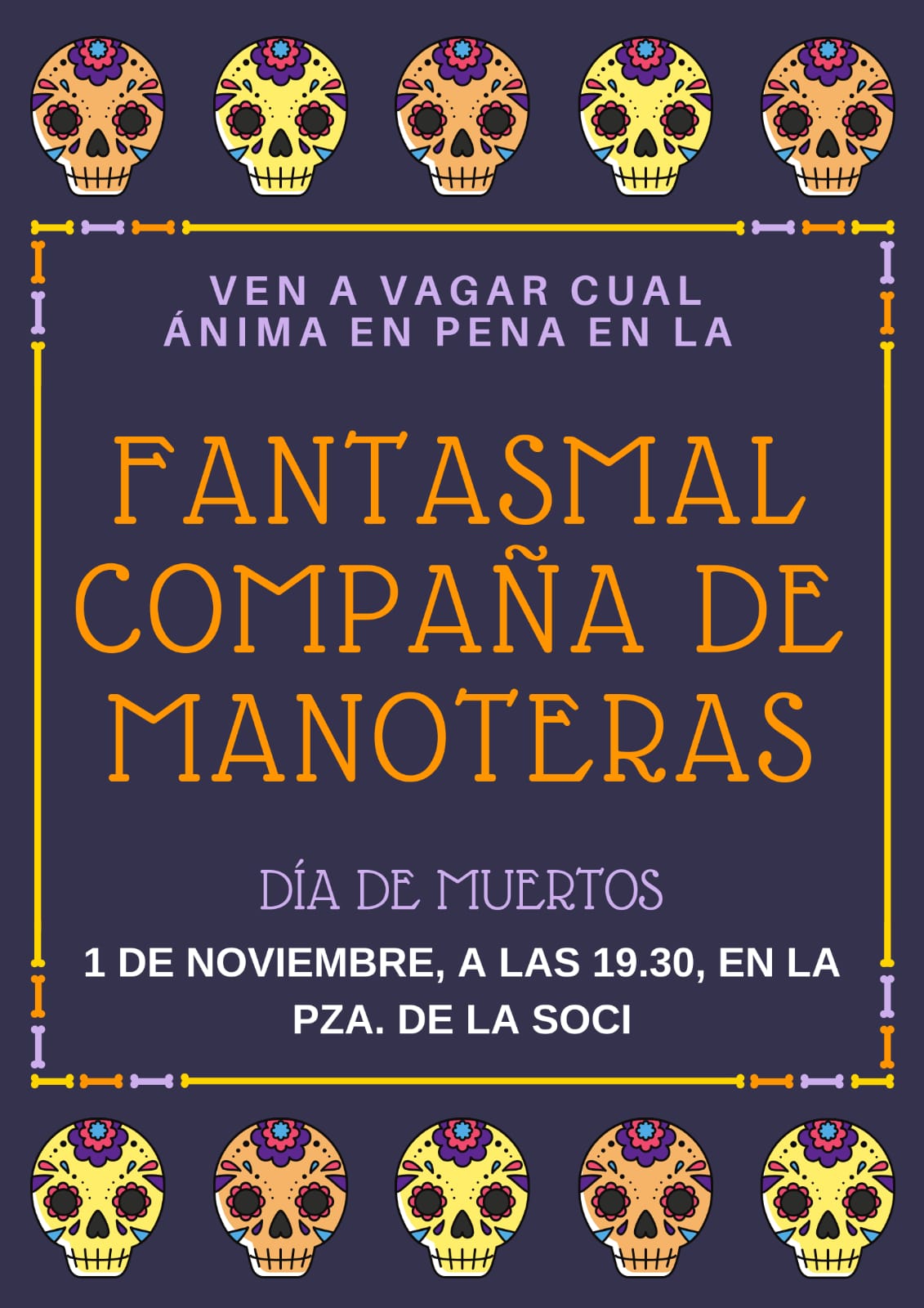 El viernes 1 habrá que volver a sacar el disfraz, ya que la idea es que a partir de las 19:30 horas el vecindario participe en una inquietante procesión para vagar por el barrio cual ánima en pena. Así, juntos y disfrazados, la Fantasmal Compaña de Manoteras, por tercer año consecutivo, recorrerá las calles del barrio desde La Soci de Manoteras hasta el Huerto Comunitario para compartir un antiguo y nuevo ritual sincrético, con queimada y alguna sorpresa más.
