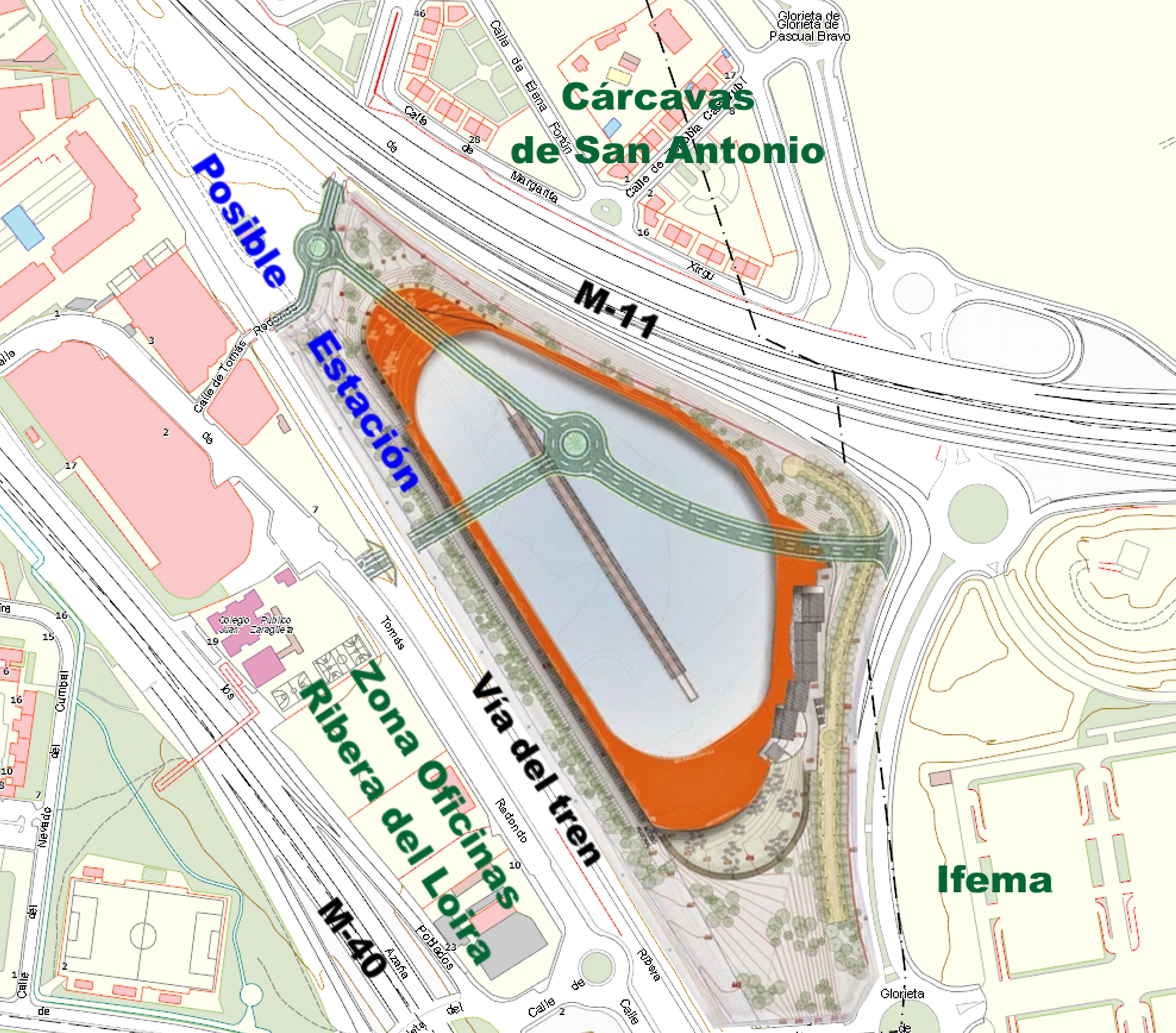 La zona de Ribera del Loira, junto al recinto ferial, tiene una forma muy alargada y se encuentra encajonada entre la M-40 y las vías del tren. Todos los días laborables, más de 25.000 personas sufren interminables atascos para ir a trabajar allí. En el año 2008, hace siete años, se aprobó la mejora de sus accesos creando enlaces con la M-11 y el recinto ferial, aprovechando esta zona triangular hasta ahora sin otro uso destinado.