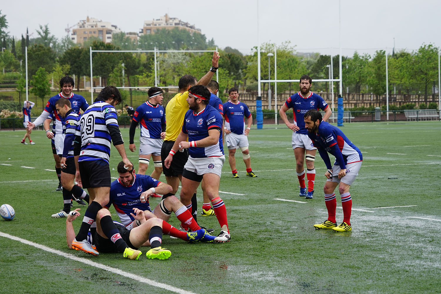 La jornada ha sido muy dura en el campo de rugby de la Avenida de las Piceas, donde el Liceo ha vuelto a jugar como local al ofrecer este terreno mejores condiciones que su estadio Ramón Urtubi. A pesar de ello, como no ha dejado de llover en toda la mañana, el césped era incapaz de drenar tanta agua. Pero como ajenos al mal tiempo, seguidores de uno y otro equipo han estado animando resguardados bajo sus paraguas. Los cánticos y gritos no han parado en ningún momento del encuentro.