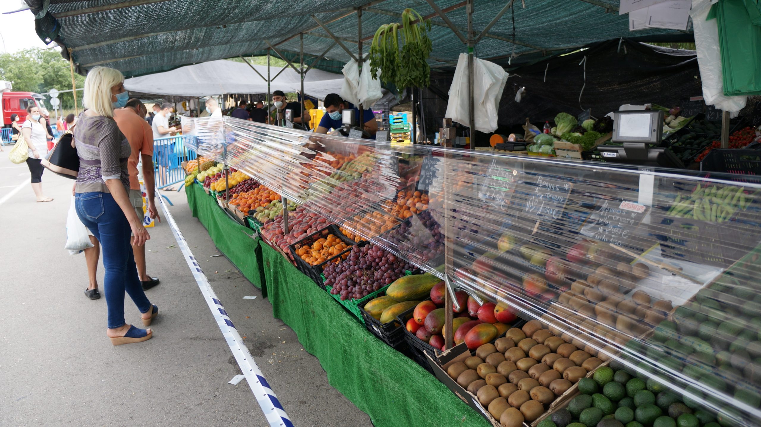 Además, se ha instaurado la obligación del uso de mascarillas y de guantes y del mantenimiento de la distancia de seguridad y se han colocado cintas policiales, e incluso barreras de papel film, para evitar que los clientes se acerquen al puesto y toquen el género.