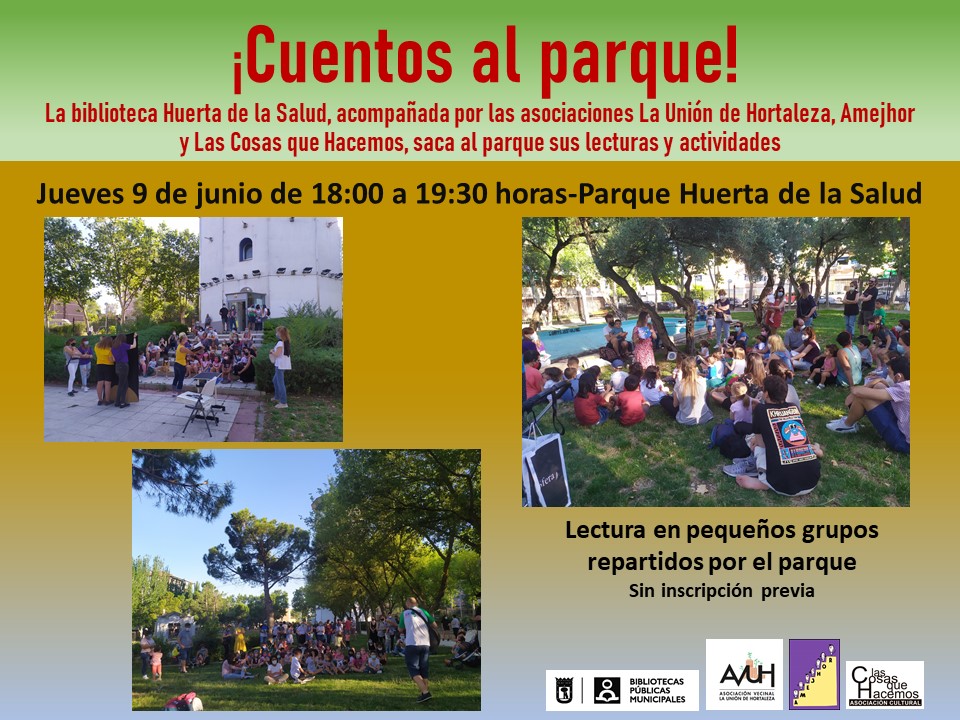 La biblioteca Huerta de la Salud, de nuevo en compañía de las asociaciones La Unión de Hortaleza, Amejhor y Las Cosas que Hacemos y por personas voluntarias, volverá a sacar sus cuentos más apreciados al parque donde se ubica. Será el jueves 9 de junio, de 18.00 a 19.30 horas. La entrada y participación son libres. Habrá lecturas para todas las edades infantiles. El parque Huerta de la Salud se llenará, una vez más, de emociones y cultura.