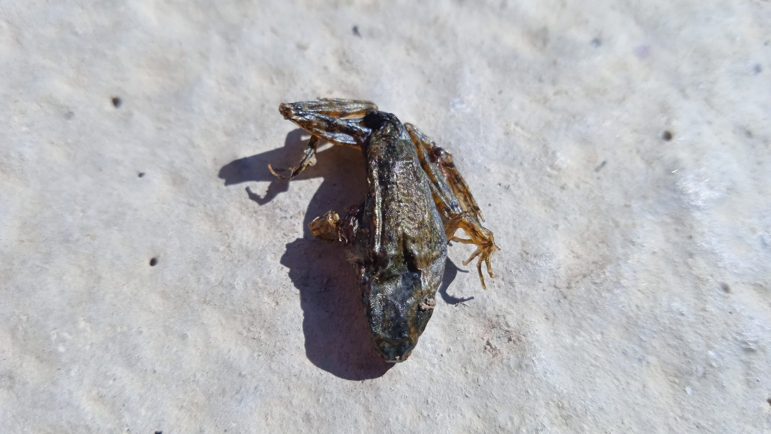 Cadáver de una de las ranas del parque Villa Rosa-Paco Caño, tras el drenaje de su ría sin haber tenido en cuenta la fauna que habitaba en ella.