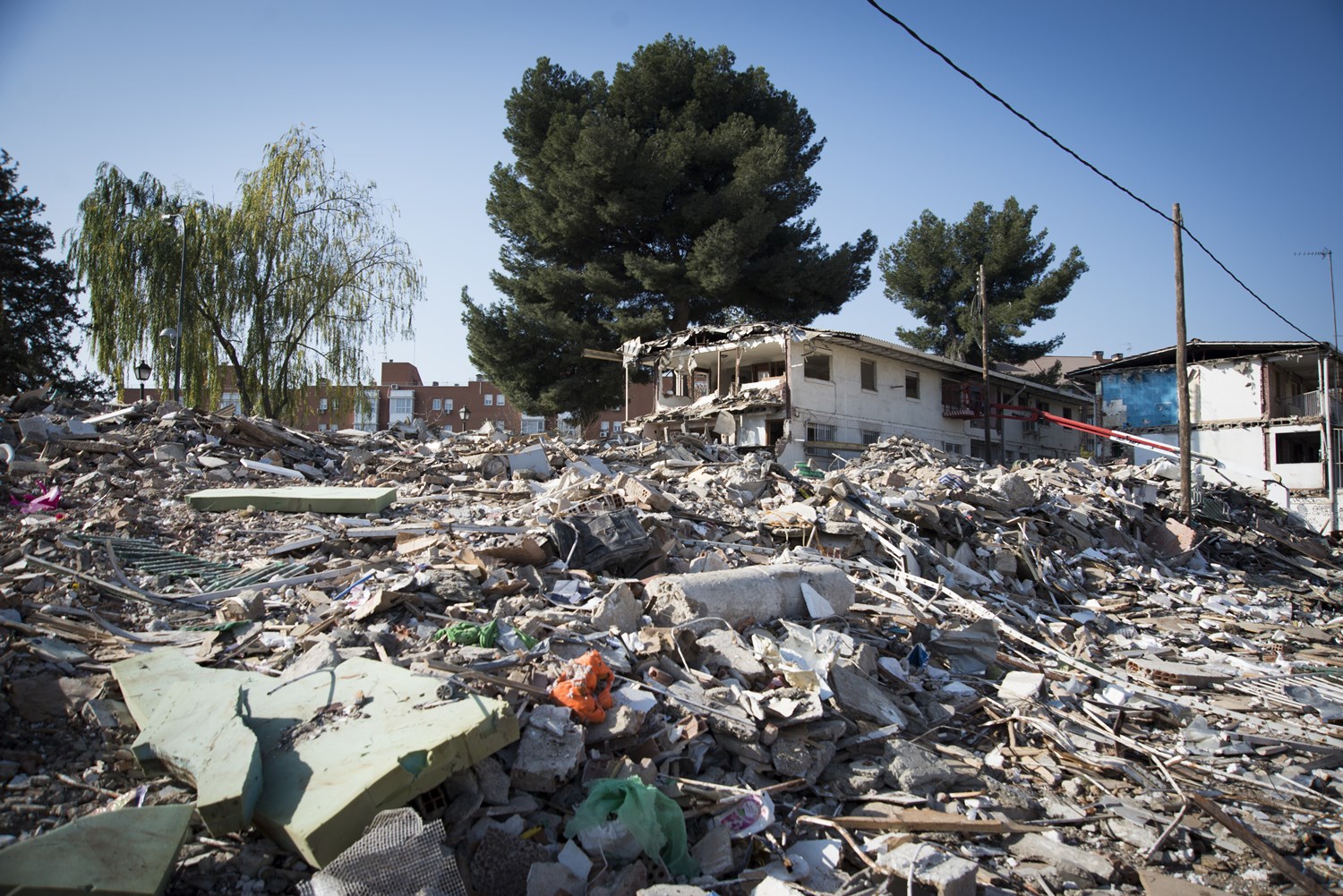 Los derribos han dejado las calles de la zona llenas de cascotes, cristales y desechos de todo tipo, por no hablar del desagradable olor a desagüe que impregna el aire. Parece que la rapidez con la que se han hecho los derribos no se ha visto reflejada en los servicios de desescombro y limpieza, lo que se traduce en graves problemas de salubridad y es peligroso para los niños, que juegan rodeados de toda esta debacle.