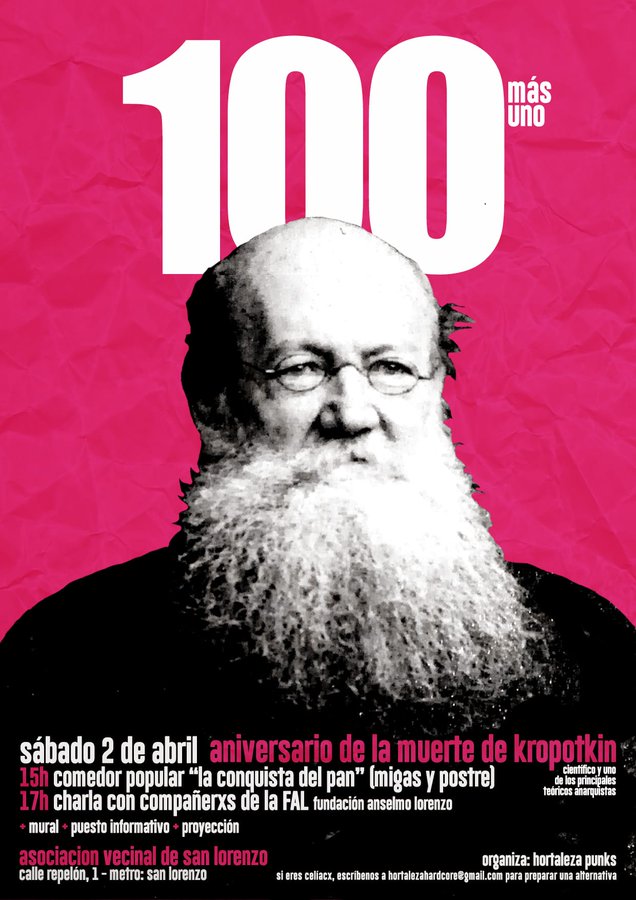 Este sábado 2 de abril la asociación La Expansión de San Lorenzo (Calle Repelón, 6) acoge una charla sobre el pensador y revolucionario Piotr Kropotkin a cargo de la Fundación Anselmo Lorenzo y organizada por el colectivo Hortaleza Punks. Será a las 17 horas, aunque antes, desde las 15 horas, se ofrecerá una comida popular.