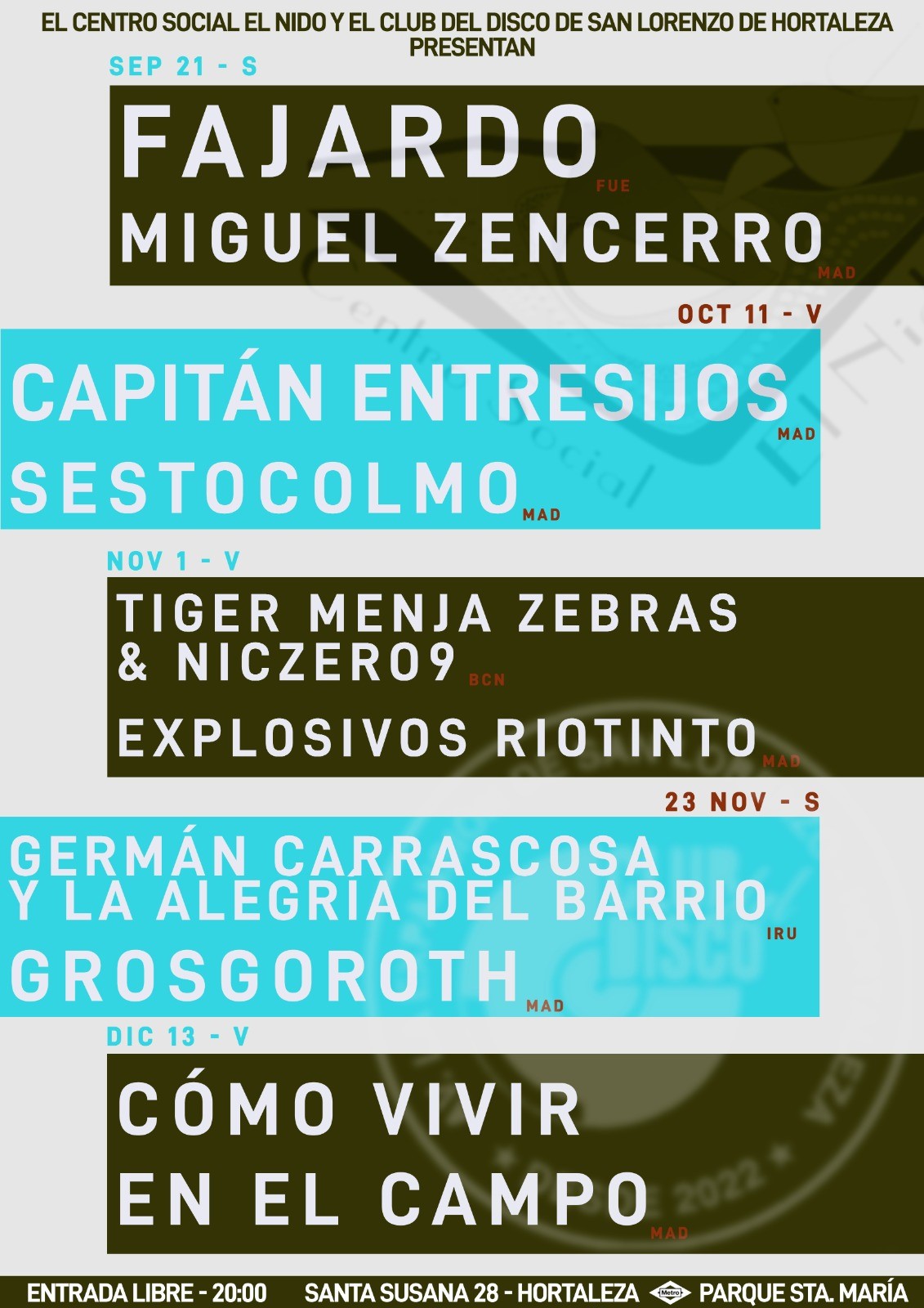 Durante los últimos meses del año, el distrito se transformará en un punto clave de la música independiente en Madrid, gracias al nuevo ciclo de conciertos organizado por el Club del Disco de Hortaleza en el centro social El Nido, ubicado en la calle Santa Susana número 28 bajo.