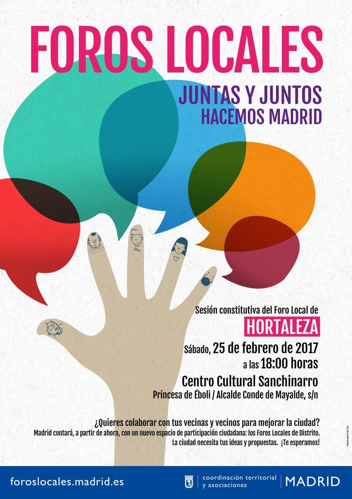 El Foro Local en Hortaleza tendrá su primera sesión el sábado 25 de febrero a las 18 horas en el Centro Cultural de Sanchinarro (Calle Princesa de Éboli con Alcalde Conde de Mayalde, s/n), en la que se crearán mesas y grupos de trabajo donde plantear propuestas, priorizarlas y debatirlas hasta su consenso y aprobación, pero también podrán integrarse mesas ya existentes y que lleven tiempo funcionando en el barrio.