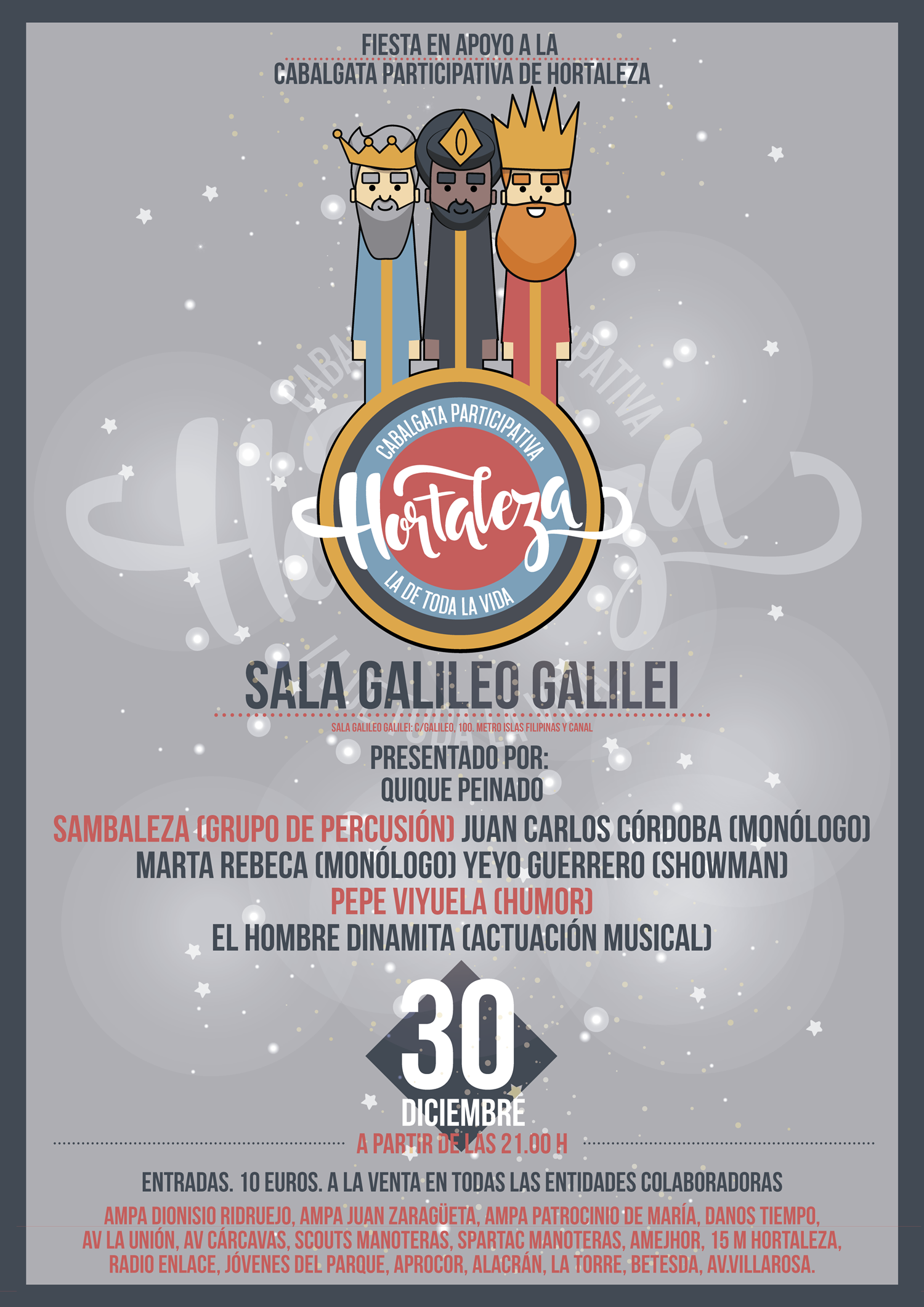 La Cabalgata Participativa de Hortaleza se financia, desde hace años, con humor, música y diversión. No se trata de ninguna metáfora. Las carrozas que llevan a los Reyes Magos por las calles de nuestro distrito se construyen gracias, en gran parte, a la recaudación de la tradicional fiesta en apoyo a la Cabalgata de la sala Galileo Galilei. Un evento clásico de la Navidad hortalina, aunque se celebre lejos del barrio.