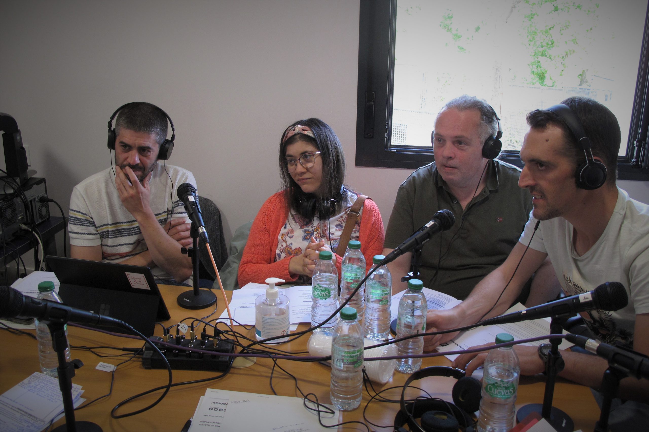 De izq. a dcha., Pablo, Blanca, Miguel y Alfredo, durante el encuentro radiofónico en el nuevo local de Radio Enlace. JULIA MANSO