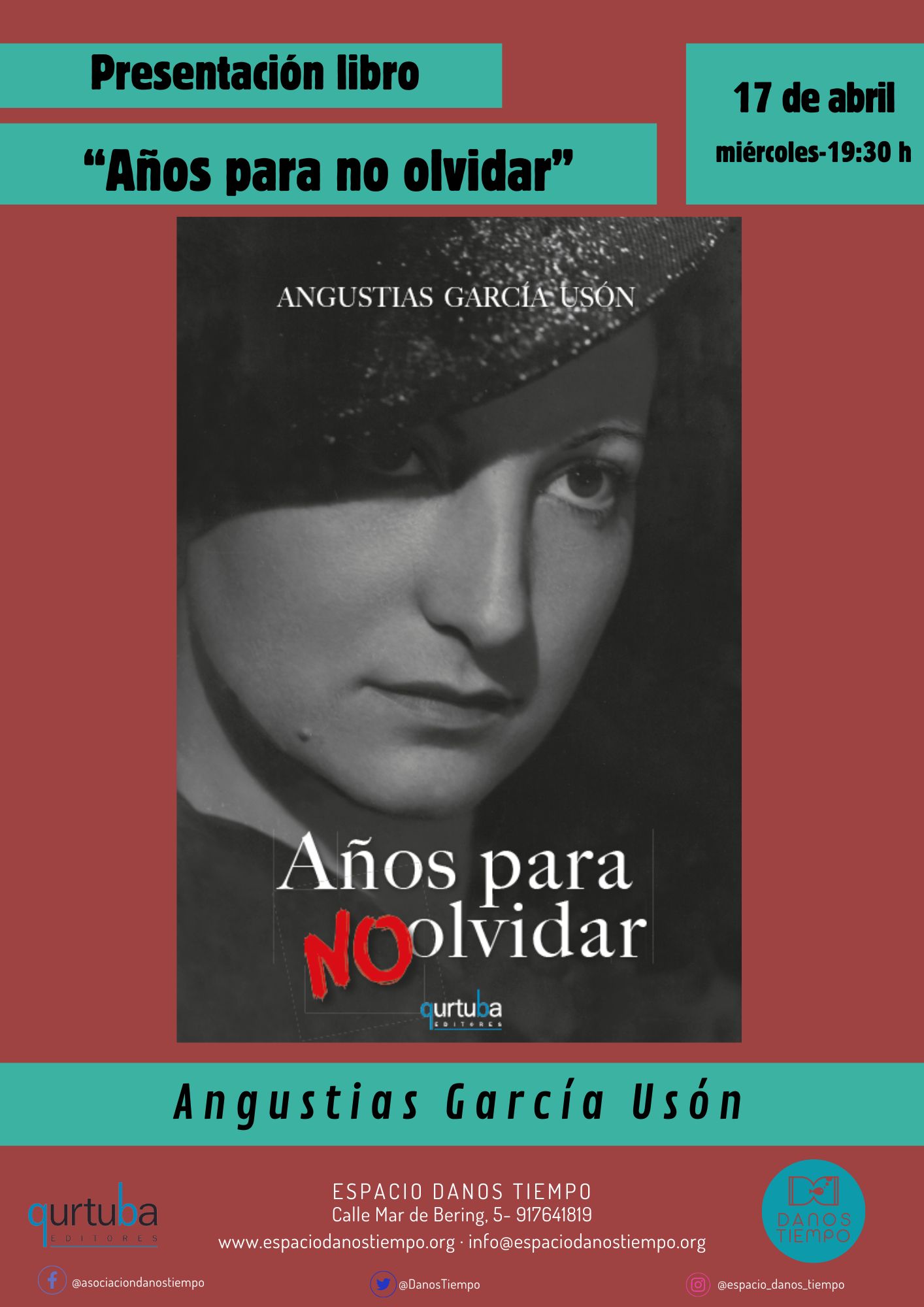 El miércoles 17 de abril a las 19.30 horas se presentará en el Espacio Danos Tiempo de Hortaleza el libro de memorias Años para no olvidar, que permanecía inédito tras ser escrito por la maestra Angustias García Usón tras su regreso a España después de tener que vivir exiliada en Argentina, por razones políticas, desde el final de la Guerra Civil hasta la llegada de la nueva democracia, una vez muerto el dictador Francisco Franco. La presentación de la obra correrá a cargo de Juan Jiménez Mancha, director de la biblioteca Huerta de la Salud, y la entrada será libre hasta completar aforo. A partir del jueves 18 de abril, el libro estará a la venta en la Librería Mar Negro y también podrá sacarse en préstamo en la biblioteca municipal Huerta de la Salud, cuando esté catalogado y registrado.
