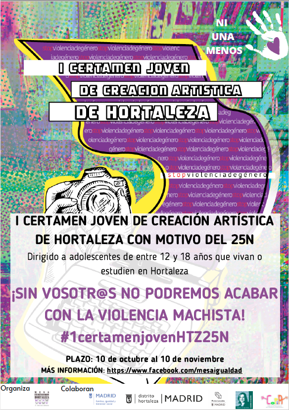 Nace un certamen artístico en el que lo más importante es luchar contra la violencia machista. Lo hemos escuchado en la entrevista que el viernes pasado Miguel Ángel Navarro, estudiante de dieciséis años, realizó en Radio Enlace a Nieves Lara, psicóloga, sexóloga y componente de la Mesa de Feminismos y Diversidad Sexual del Foro Local de Hortaleza, entidad organizadora el I Certamen Joven de Creación artística de Hortaleza.