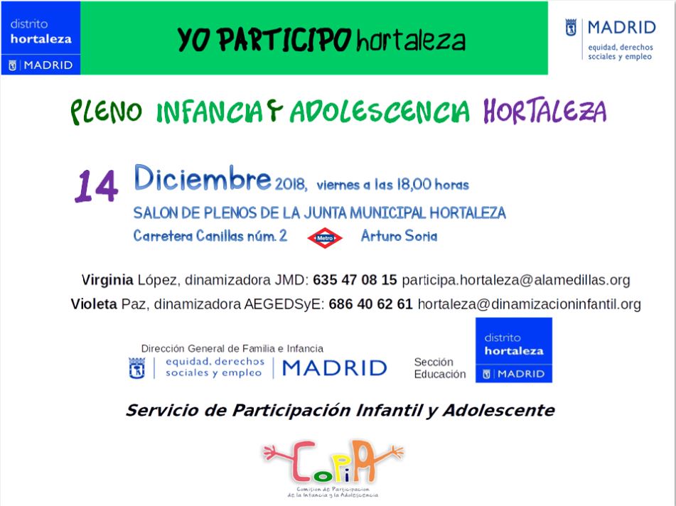 Esta iniciativa procede de la Junta Municipal de Hortaleza junto con el Área de Dirección General de Equidad, Derechos Sociales y Empleo. Ambas instituciones han aportado dos dinamizadoras: Virginia López, por la Junta Municipal y Violeta Paz, por el Área. El objetivo era conocer cómo los jóvenes querían participar y qué necesitaban para ello. Este era el camino inicial para constituir la Comisión de Participación de la Infancia y la Adolescencia (COPIA) en el distrito, es decir, crear un mecanismo de participación para que se les escuche y se tengan en cuenta sus opiniones y propuestas.