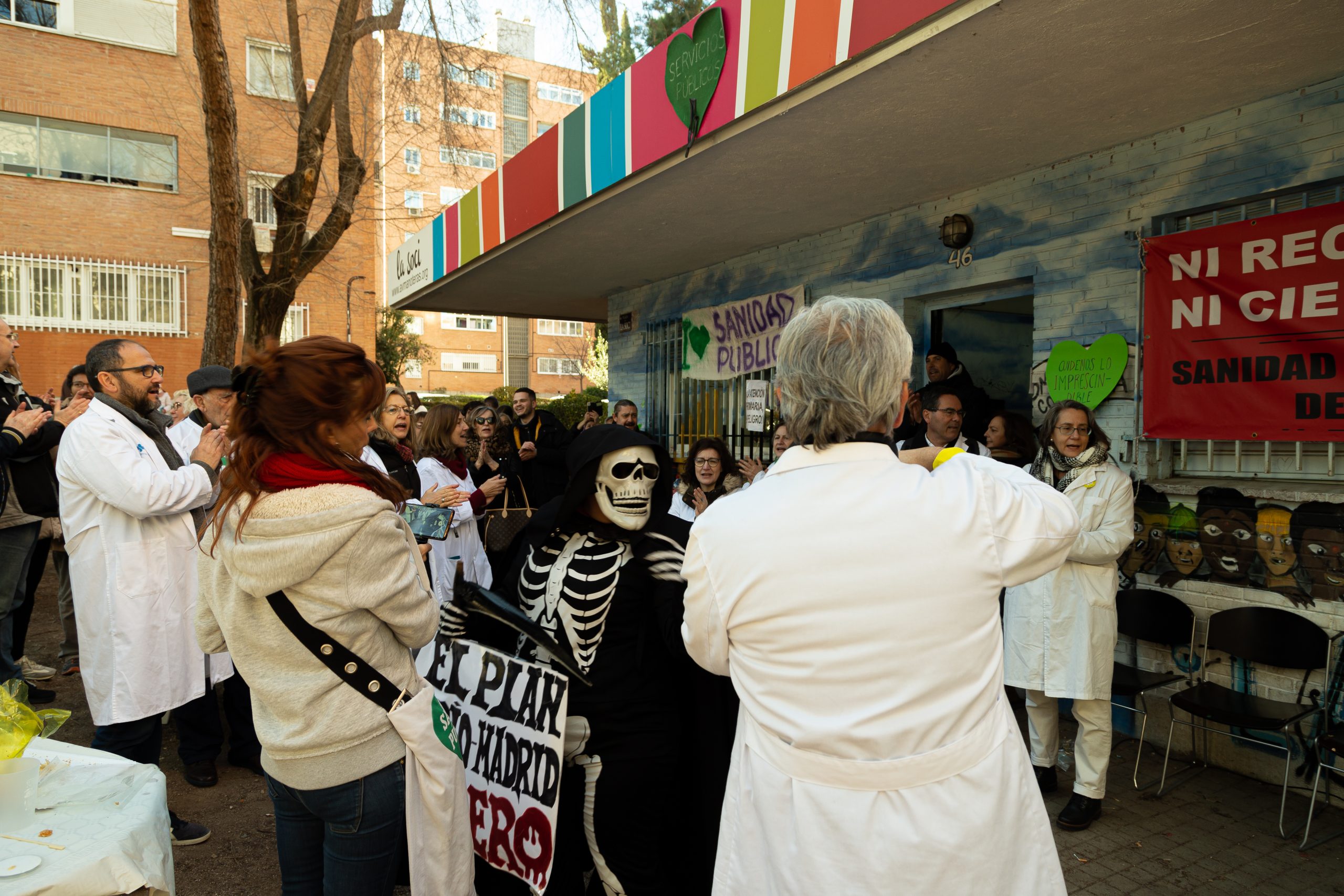 El objetivo era hablar con los médicos encerrados y plantearles cuantas preguntas surgieran. Esta vez, a la luz del día. Se pudieron escuchar datos, argumentos, preguntas, testimonios, emociones y el ruego de difundir. Además de más de una decena de batas blancas, de negro la Muerte, portaba un cartel con el texto «SOY EL PLAN SANITARIO. MADRID, OS ESPERO». Este personaje protagonizó una divertida performance en la que hubo de huir cuando los médicos se unieron.