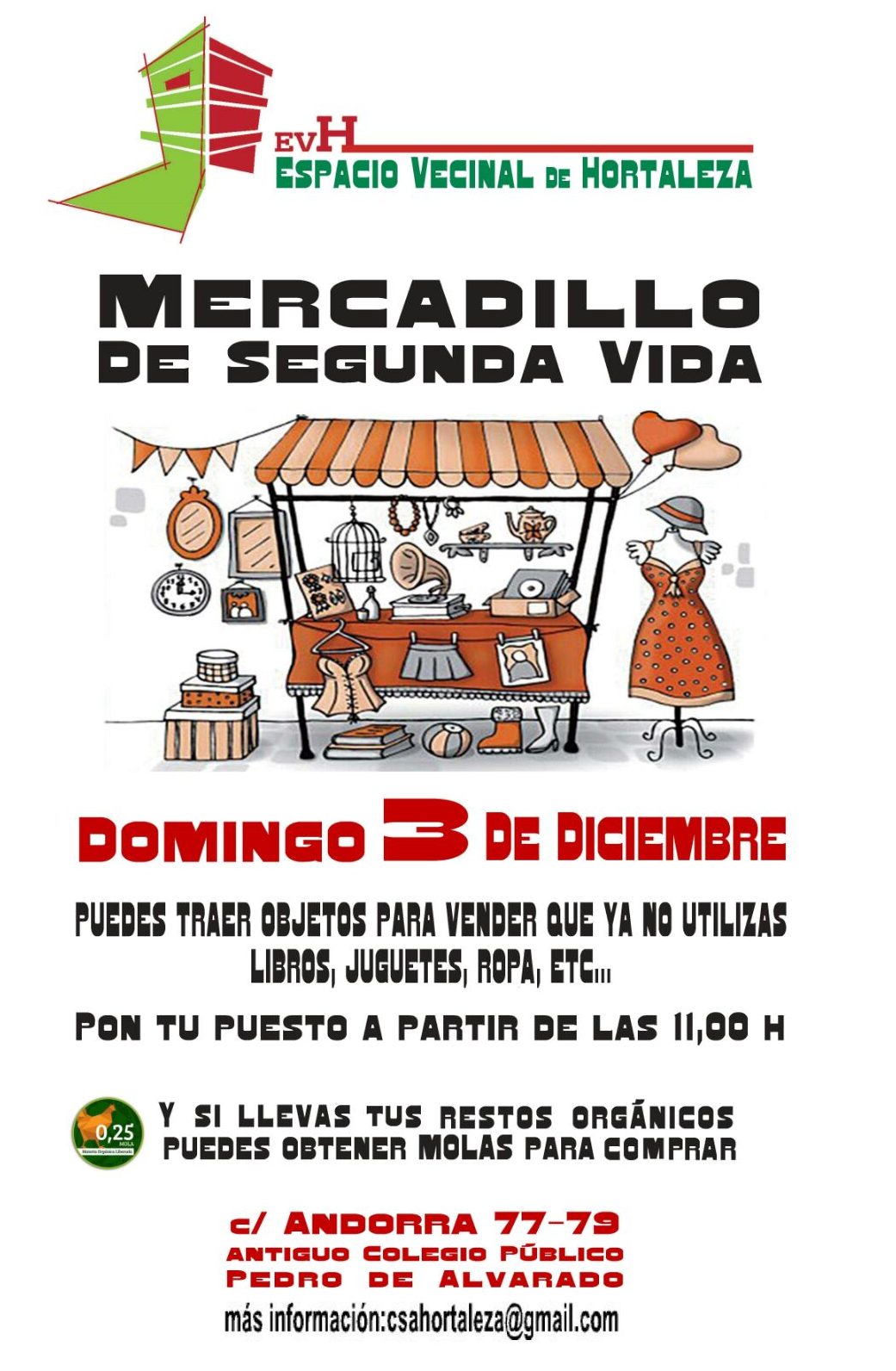 Espacio Vecinal de Hortaleza Calle Andorra, 77-79, MadridEl domingo 3 de diciembre, de 11 a 14 horas, se celebra un Mercadillo de segunda vida organizado por el Espacio Vecinal de Hortaleza en las instalaciones del antiguo colegio público Pedro Alvarado (Andorra, 77-79). Trae objetos, juguetes, libros, ropa, etc., que quieras vender, pero que puedan usarse. También habrá mercadillo de productos ecológicos, un […]