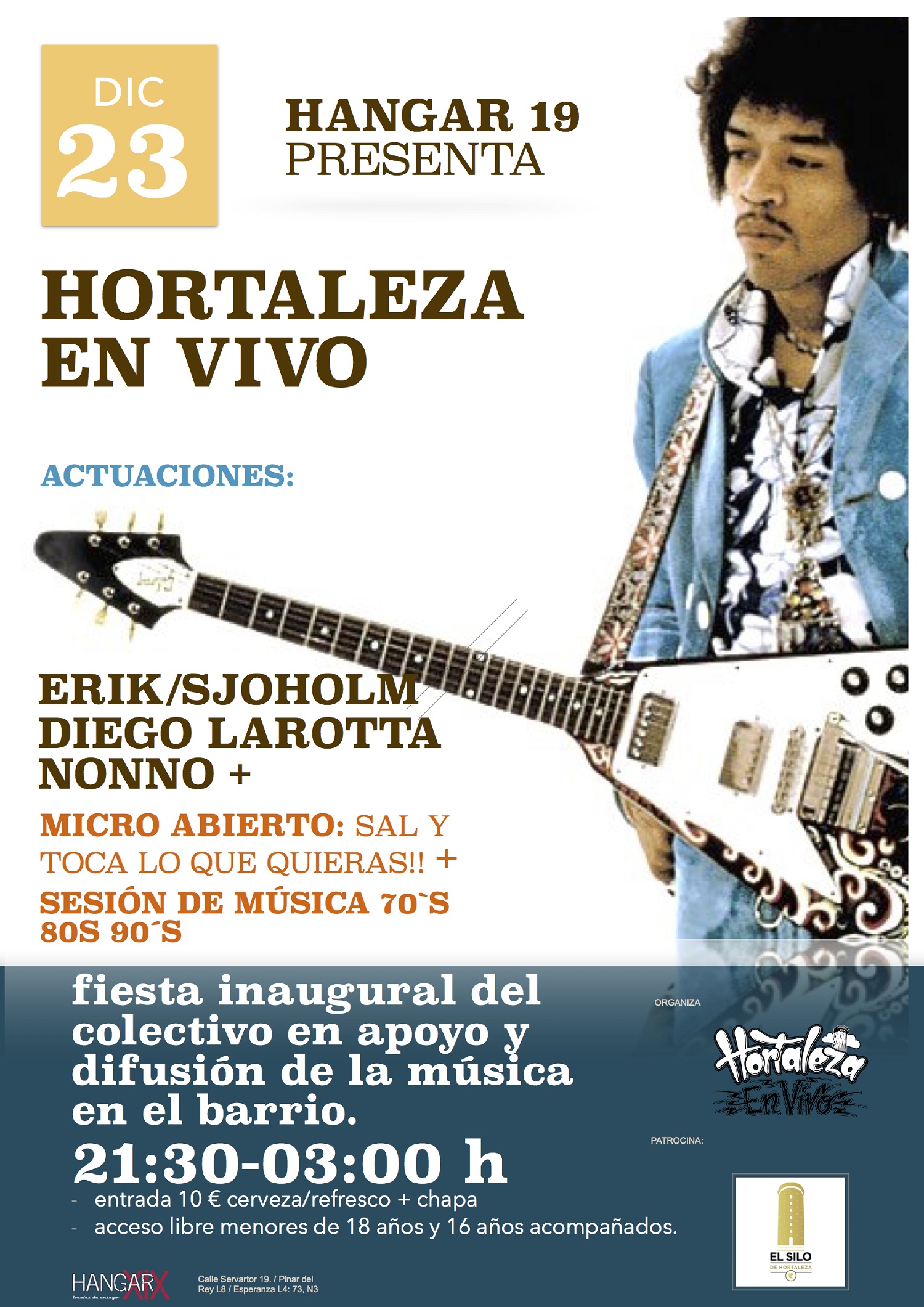 La plataforma musical Hortaleza en Vivo se presenta el viernes 23 de diciembre con una gran fiesta en la sala Hangar 19 de Canillas (Calle Servator, 19. Metro Pinar del Rey y Esperanza).  La fiesta comenzará a las 21:30 horas y contará con la actuación del grupo Nonno, Erick Sjoholm y Diego Larotta. Además, habrá […]